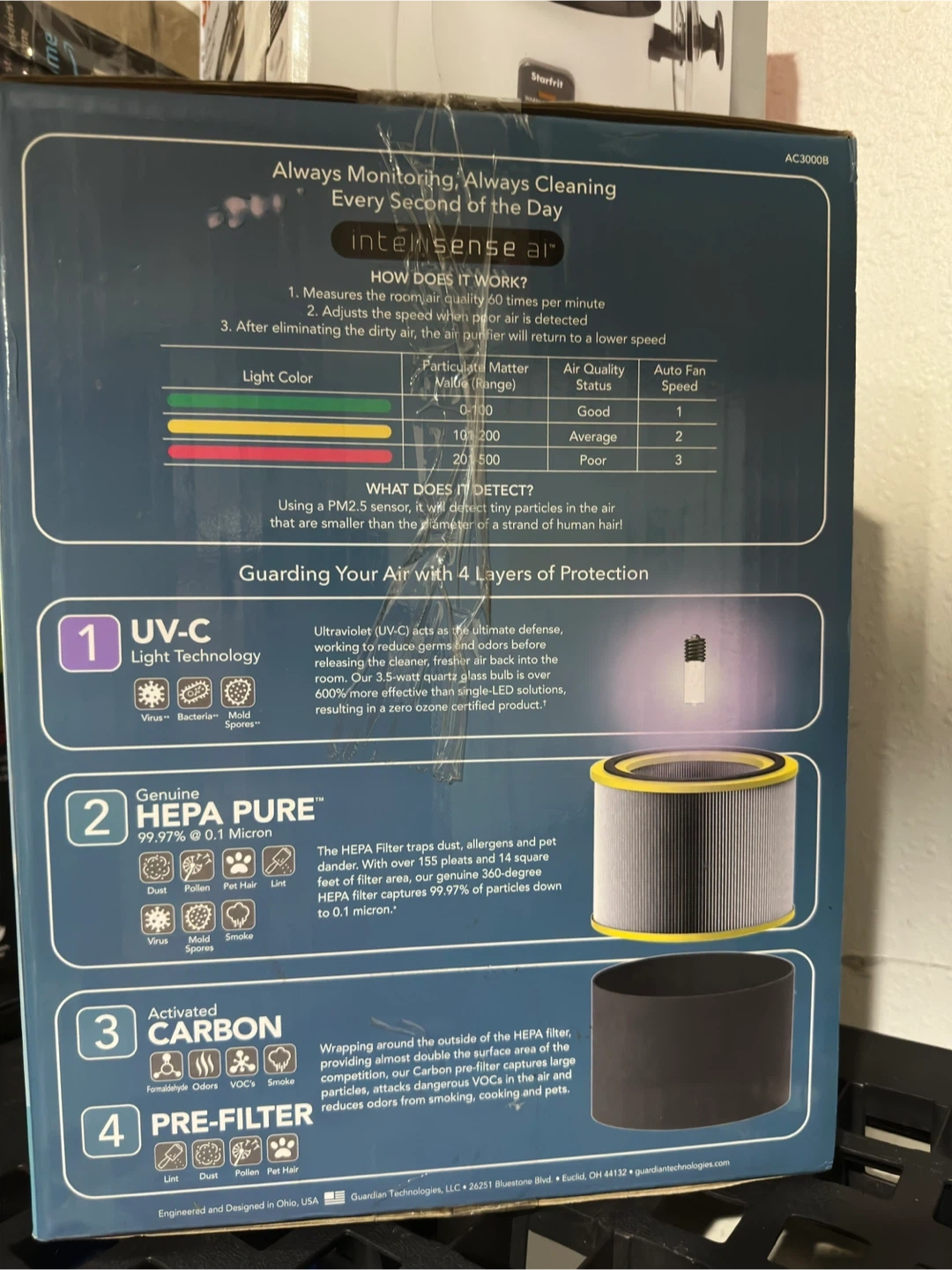 Selling a Germ Guardian AirSafe+ purifier with HEPA and UV-C light technology. It cleans 1043 sq ft every hour. It features Intellisense AI that measures air quality and adjusts automatically. It also has a pre-filter and activated carbon filter. Box included