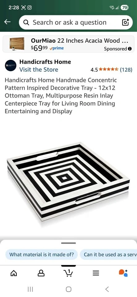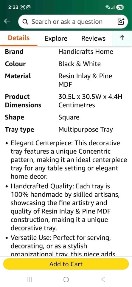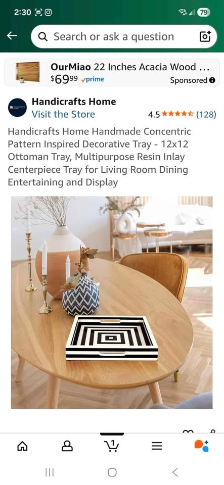 Handmade decorative tray with a concentric pattern design. Made with resin inlay and pine MDF board. Has rubber feet bumpers on the bottom. Measures 12x12 inches with a height of 1.75 inches. Durable and multi-purpose for use as a centerpiece or display tray. Great option for a Housewarming, Christmas or any other special occasion gift. Sells on Amazon for $79.00+ tax= $89.27. You can buy here for more than half price off.