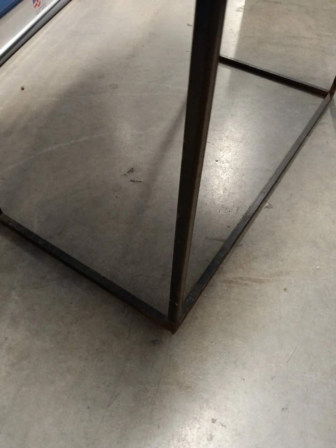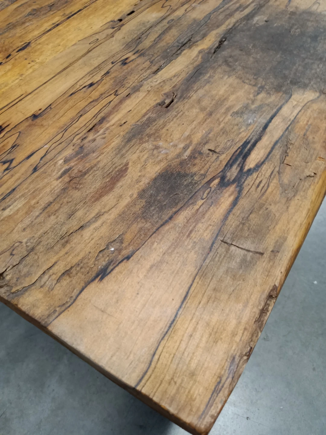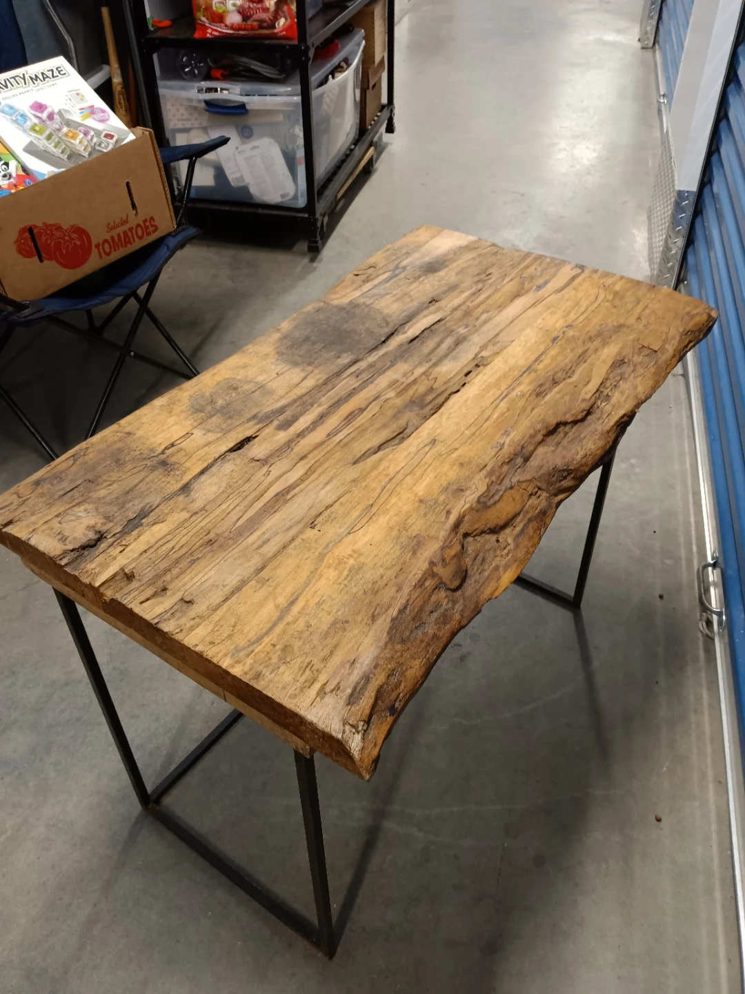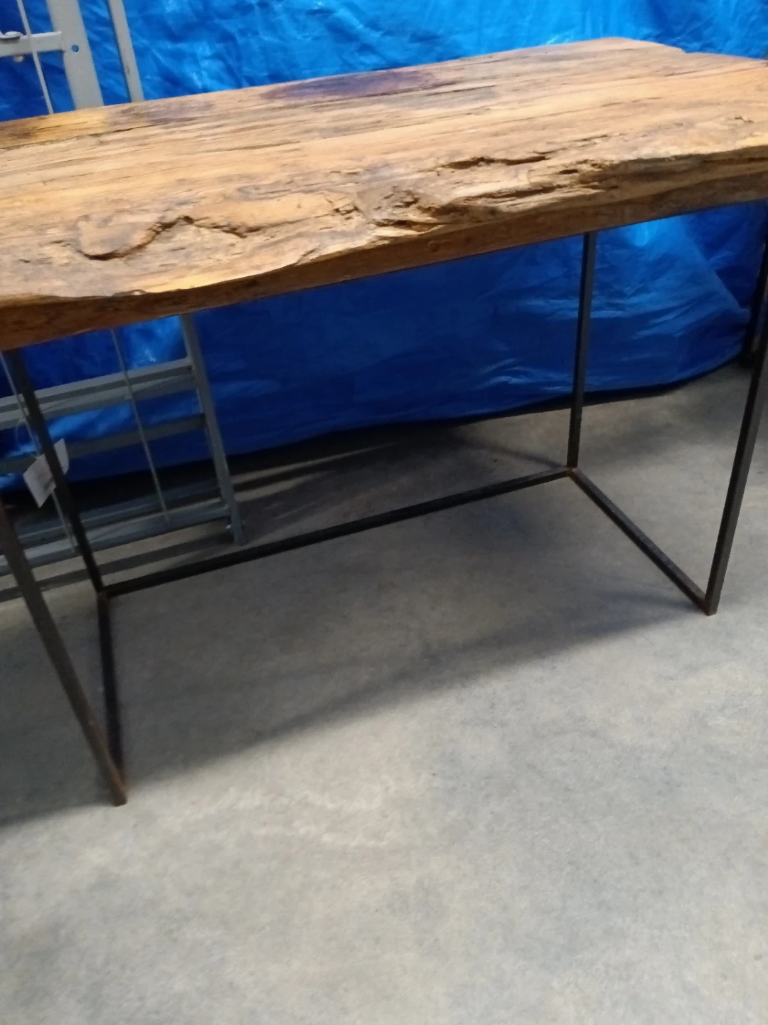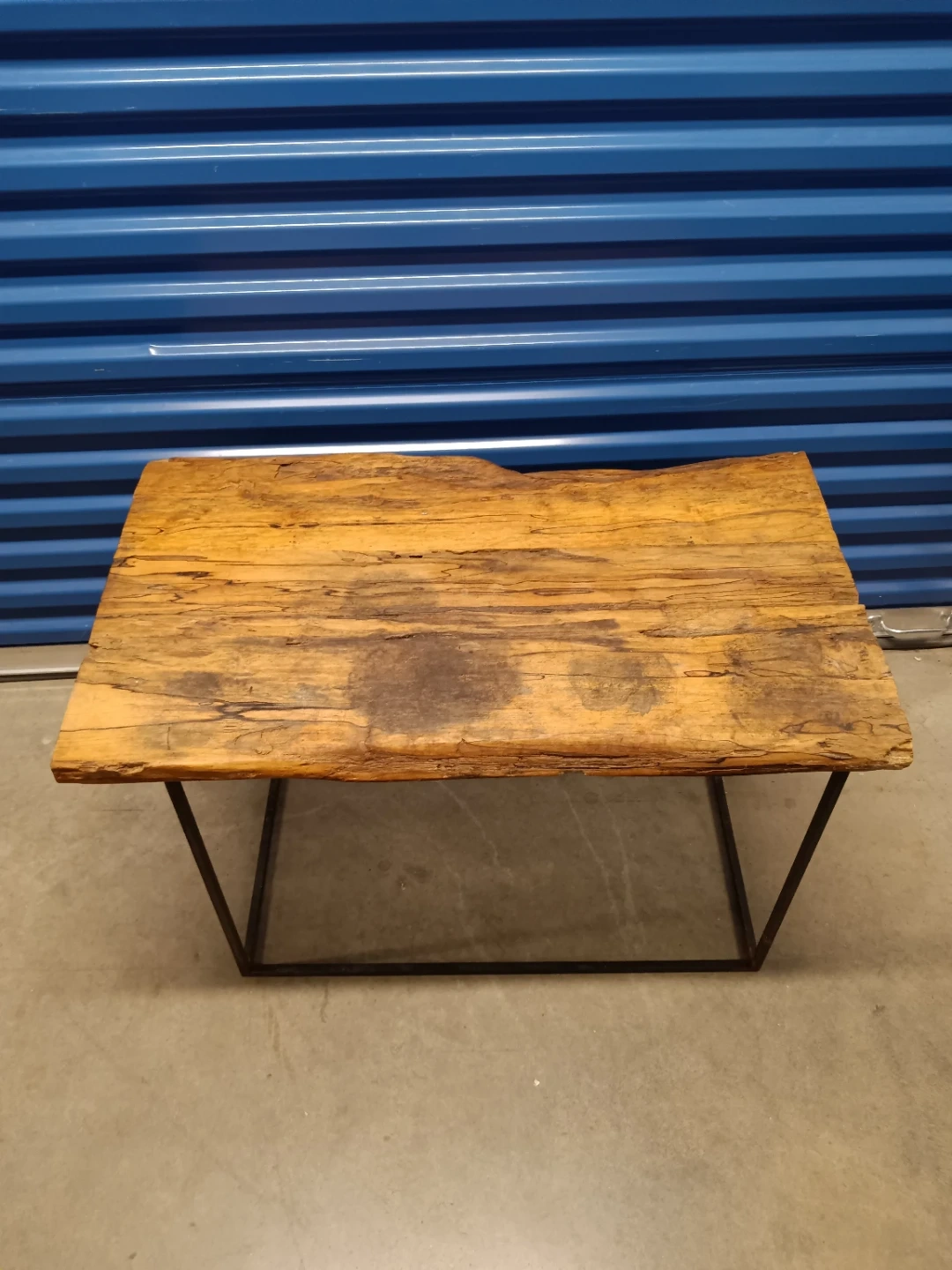 This coffee table features a unique live edge wood top with a rustic, natural finish. It's supported by a modern, slim metal frame. The wood shows interesting grain patterns and textures. Measures approximately 47" long x 23" wide x 18" high.