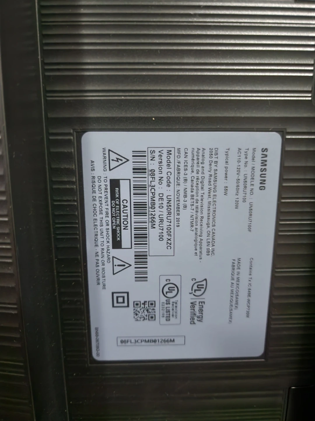 This is a Samsung 50-inch 4K UHD Smart TV. It supports AC110-120V, 50/60Hz, 190W power input. This TV is great for streaming and gaming. It was manufactured in November 2019. I am selling this TV for cheap as it has an obvious dark spot in the screen and me and my partner got a new TV! This TV is still FULLY FUNCTIONAL and had the power cord, mounting bars and remote and unfortunately the original screws for the legs are misplaced so the current screws in the legs aren't the right fit so the legs are a tad loose but they do hold. This TV can be bought for anyone who wants a cheap TV or a TV for parts!!