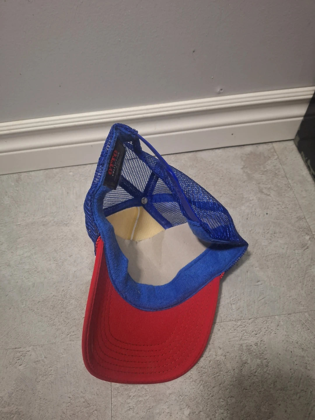 This DBZ OTTO Collection trucker hat features a blue mesh back and a red brim with a white front panel. It's made of 100% Polyester & 100% Nylon and is a One Size Fits Most. Keep cool with this classic hat!