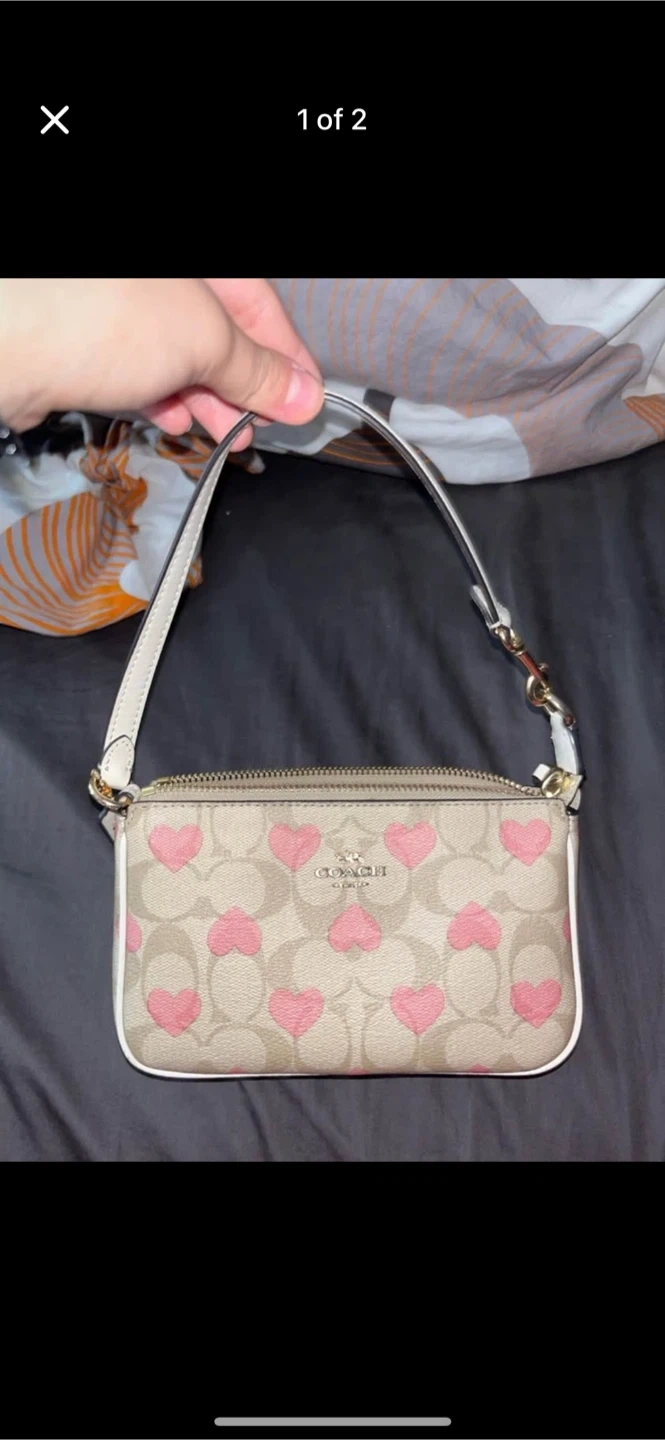 Selling my authentic Coach Valentine’s Limited Edition mini shoulder bag in the signature beige canvas with pink heart print. It features gold hardware, a zip-top closure, and a detachable white leather strap. Such a cute statement piece — perfect for Valentine’s, date nights, or adding a soft girly touch to any outfit 💕