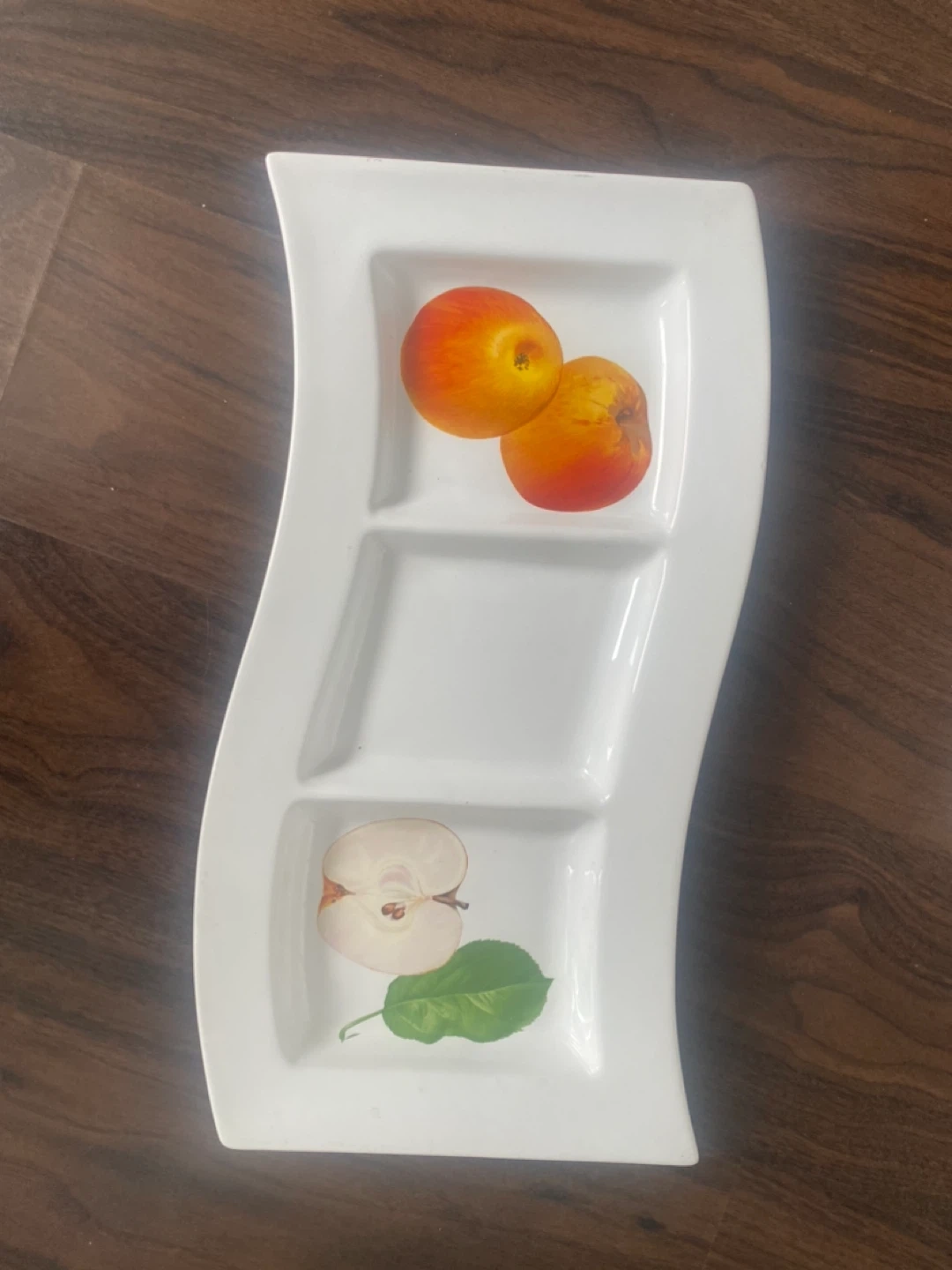 A white ceramic divided serving tray featuring a charming apple design. It's perfect for serving appetizers, snacks, or condiments. This tray is a lovely addition to any kitchen or dining setting!