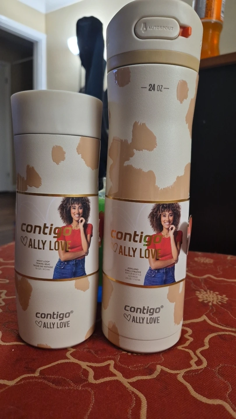 This set includes a Contigo West Loop travel mug (16 oz/473 mL) and an Ashland Chill Frappe water bottle (24 oz/710 mL). Both feature the Ally Love design and AUTO SPOUT lids. Great for keeping your drinks hot or cold on the go! Brand new- Never used.