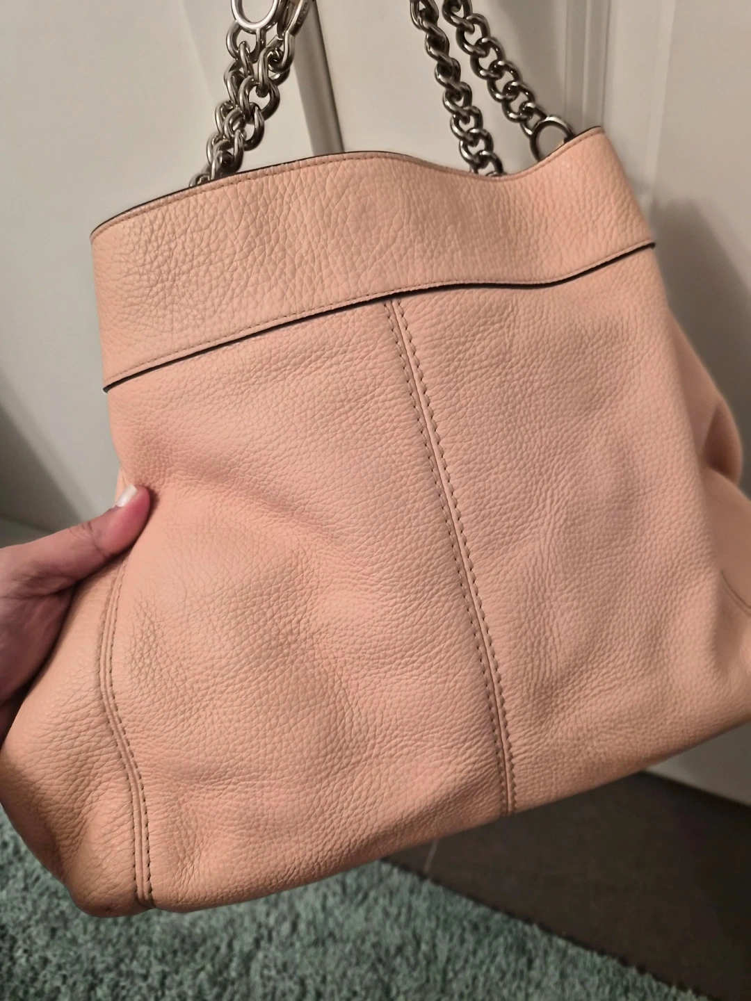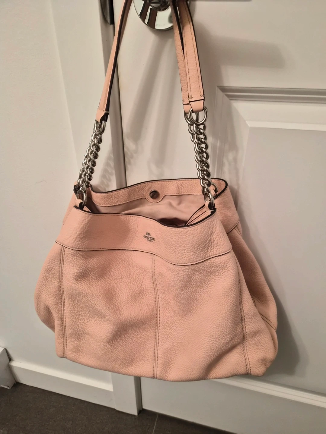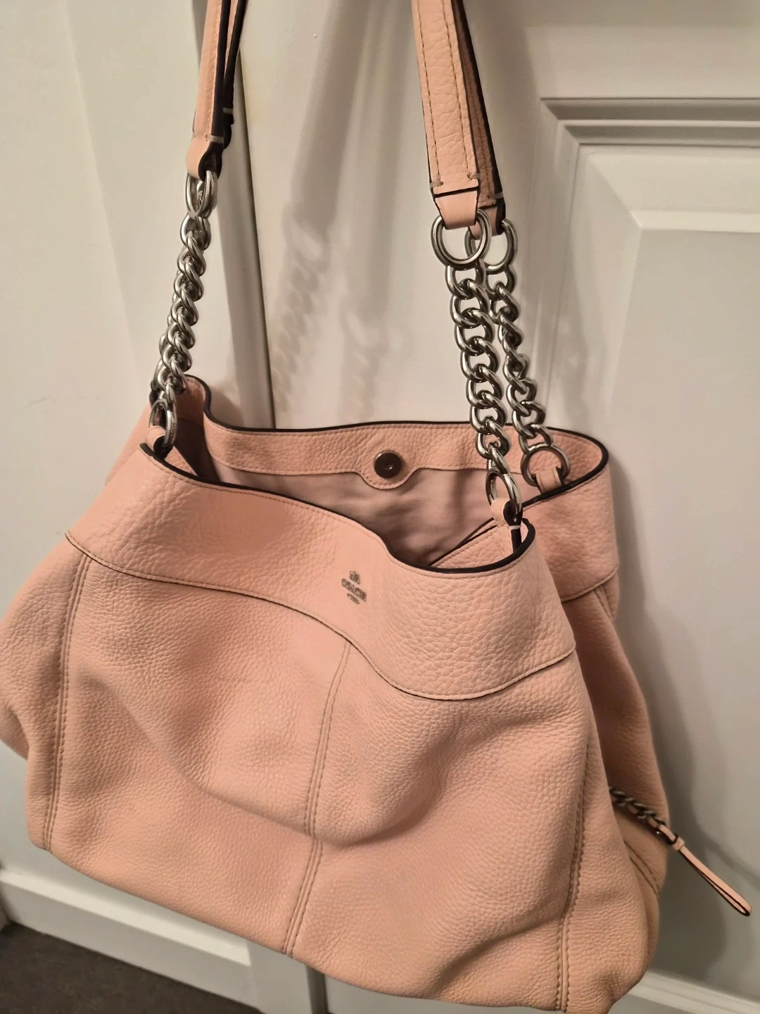 This is a Coach shoulder bag in a lovely pink pebbled leather. It features silver chain straps and a secure top snap closure. The interior has multiple pockets, and it's a great size for everyday use!