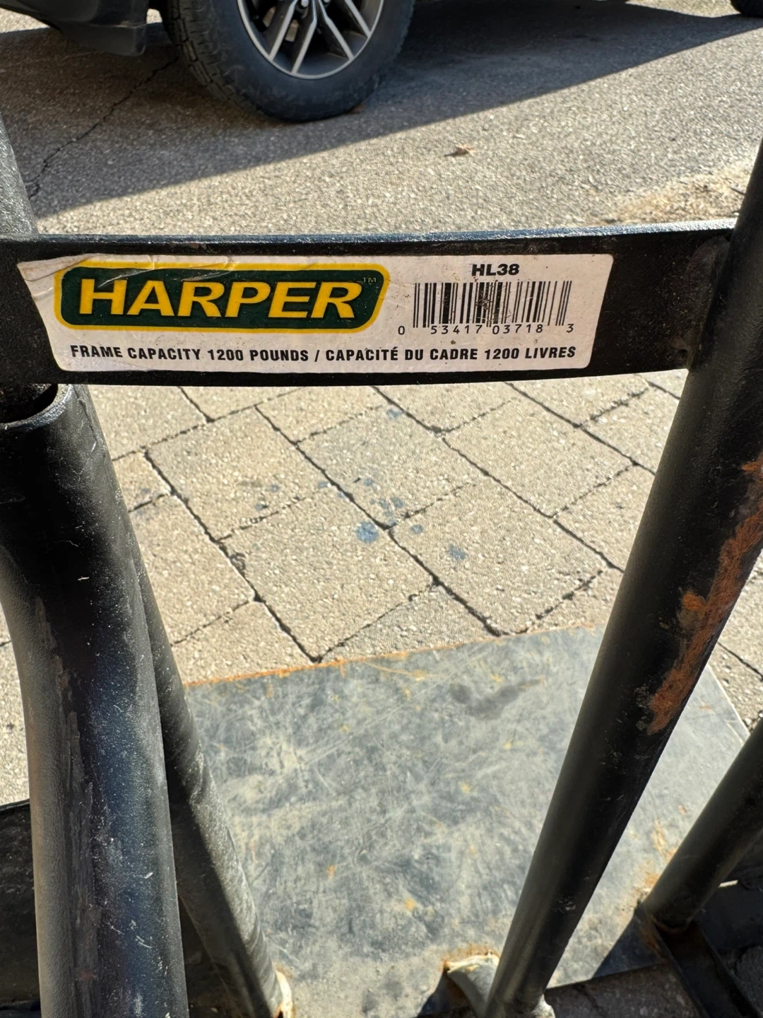 Harper hand truck dolly with HL38 model designation. It has a frame capacity of 1200 pounds. Heavy-duty tires for moving large loads.