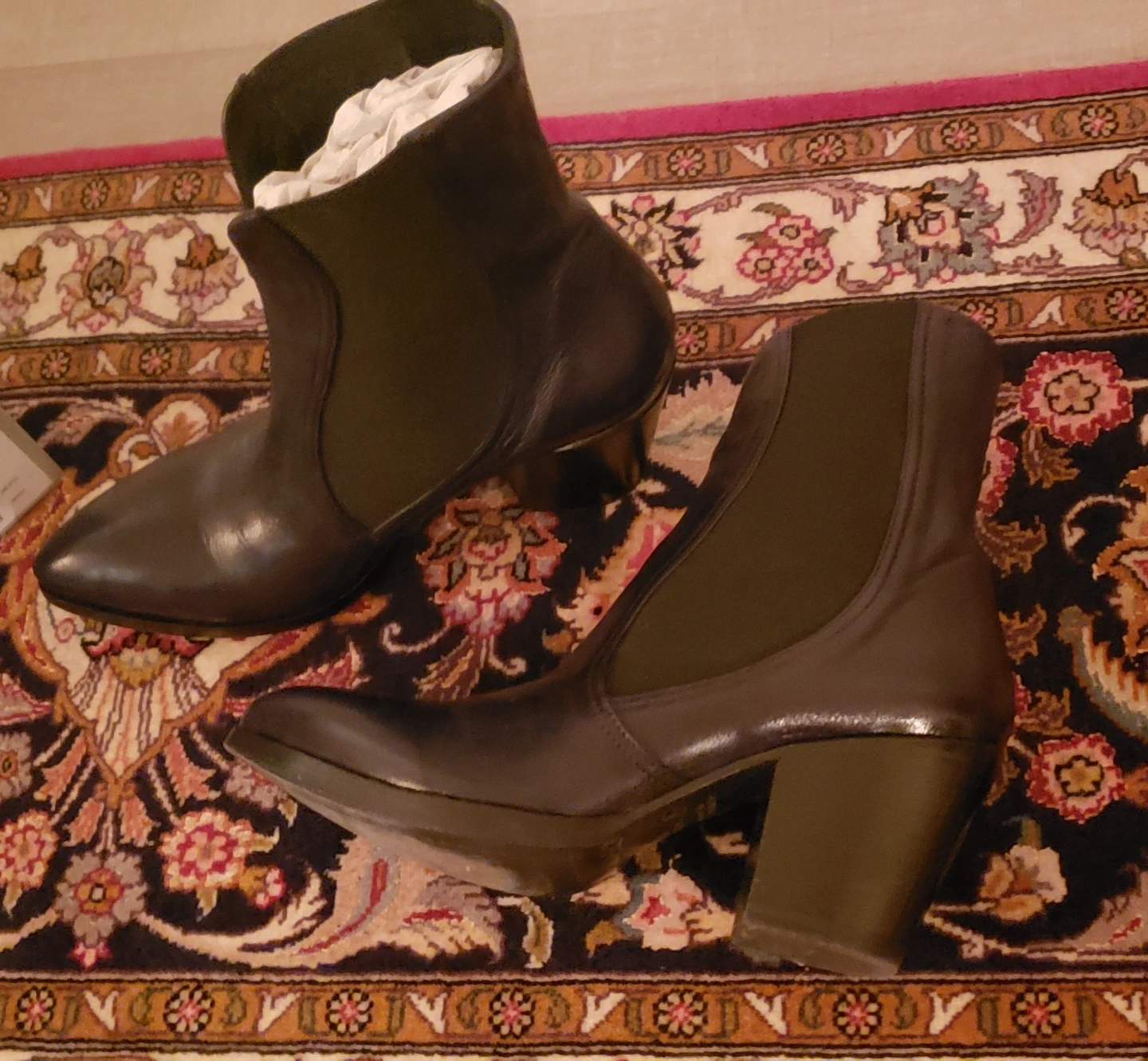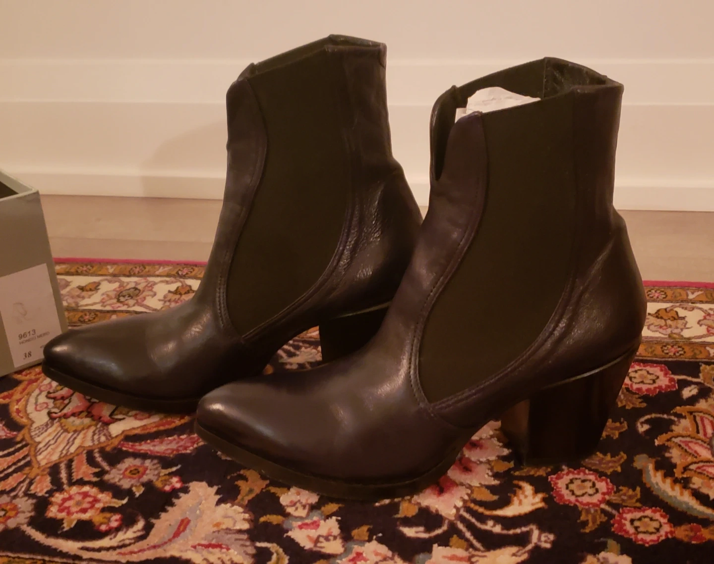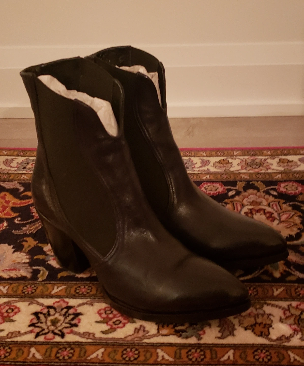 Classic black leather Chelsea boots with elastic side panels, slip on, flattering contours, and premium leather. These boots feature a pointed toe, slip cut in the front line-of-sight, a stacked block heel, and classic Rocco. P. heel. Add these to your fall/winter dressy, high quality collection of shoe choices at half their price!