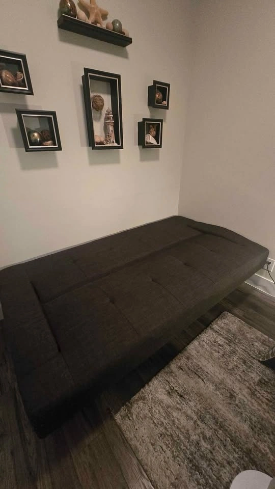 Modern, clean design with tufted cushions and padded armrests. Easily converts from a couch into a flat bed—perfect for guests, small spaces, apartments, offices, or a spare room.