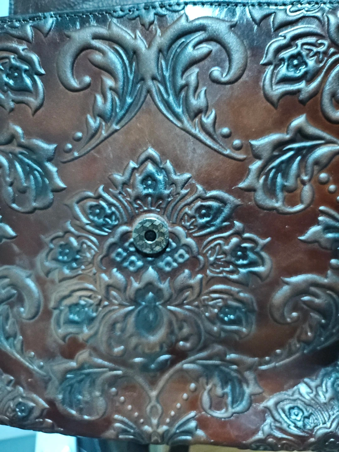 This stylish brown leather backpack features a detailed embossed floral design. It's a medium-sized bag with adjustable straps for comfort. A beautiful accessory for everyday use!