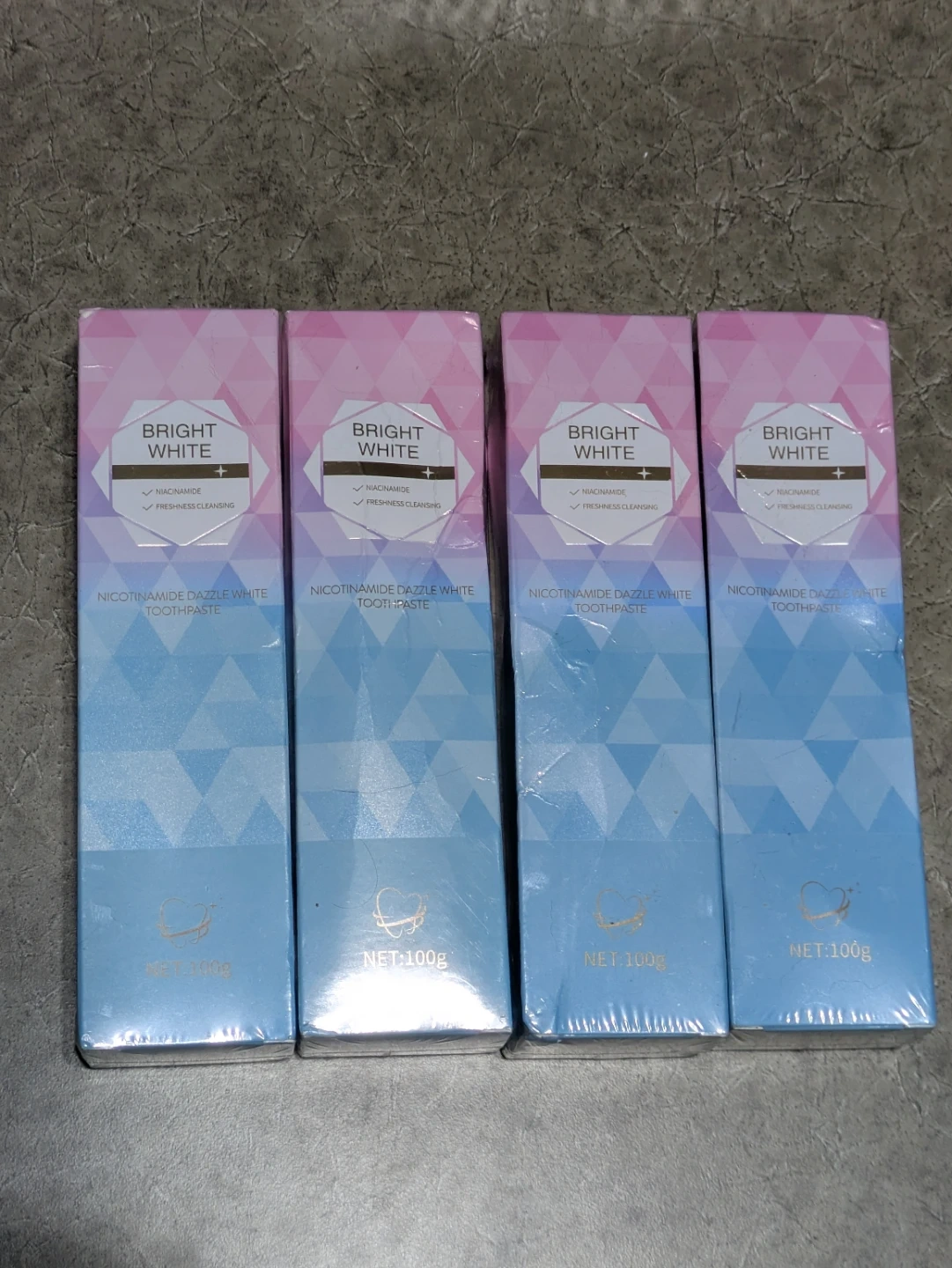 4 tubes of Bright White Nicotinamide Dazzle White Toothpaste. Each tube contains 100g. It's formulated with niacinamide for freshness and cleansing..