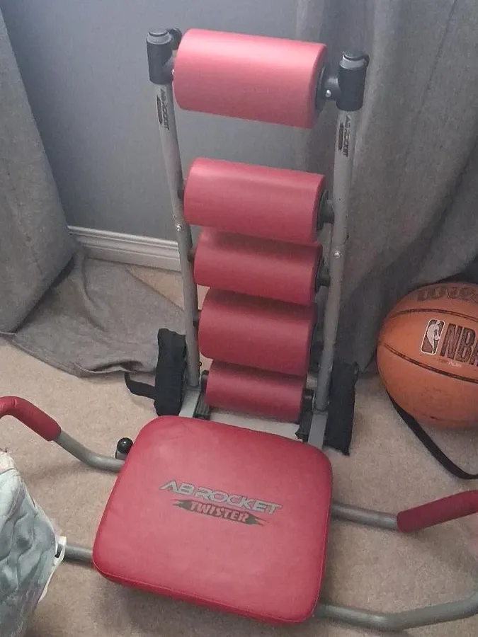 This is an Ab Rocket Twister exercise machine. It has a red padded seat and red rollers for back support. The frame is made of metal and plastic.