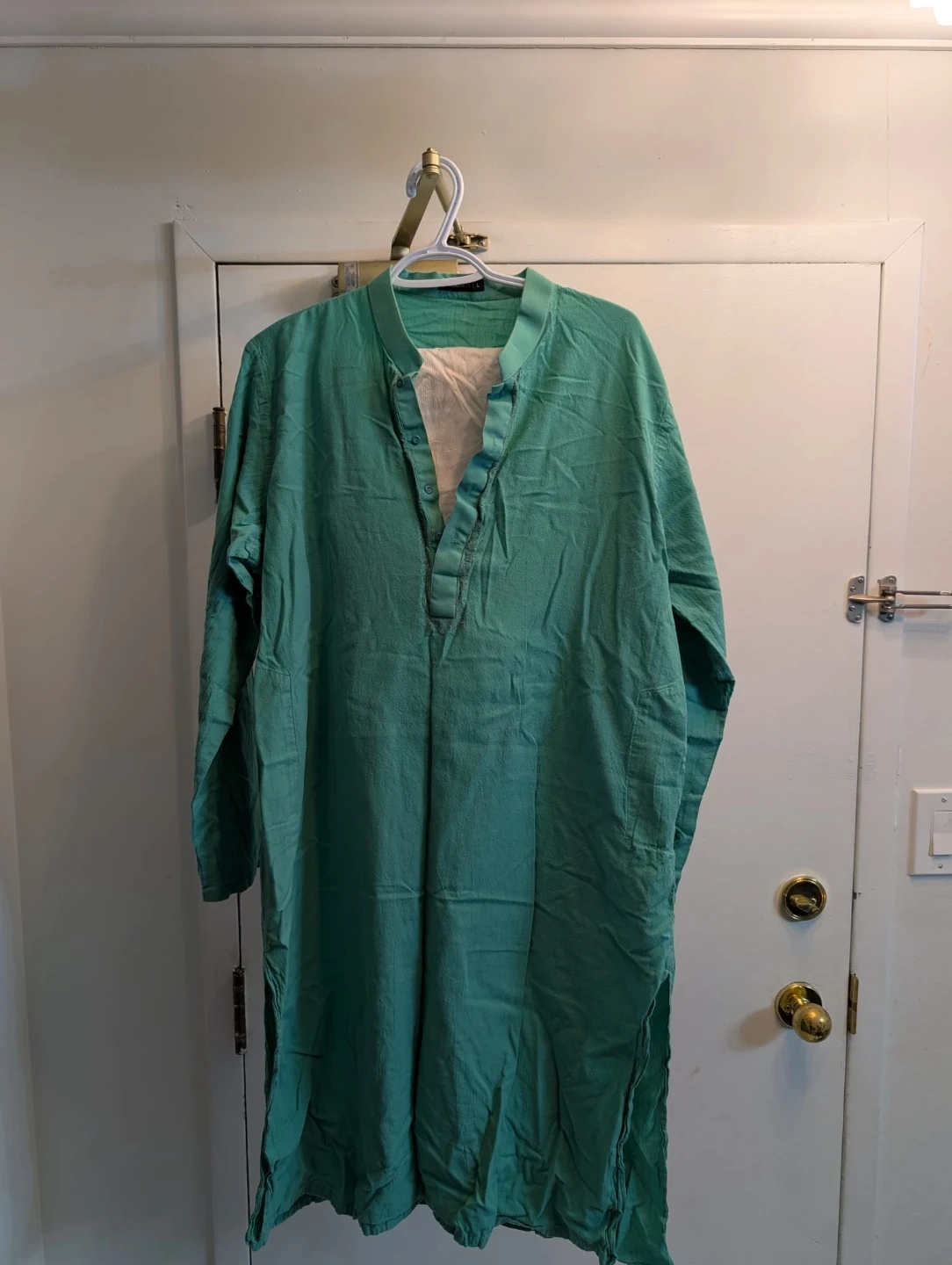 A green shalwar Kameez with a mandarin collar. It has a button-up placket and long sleeves. Made from a lightweight fabric.