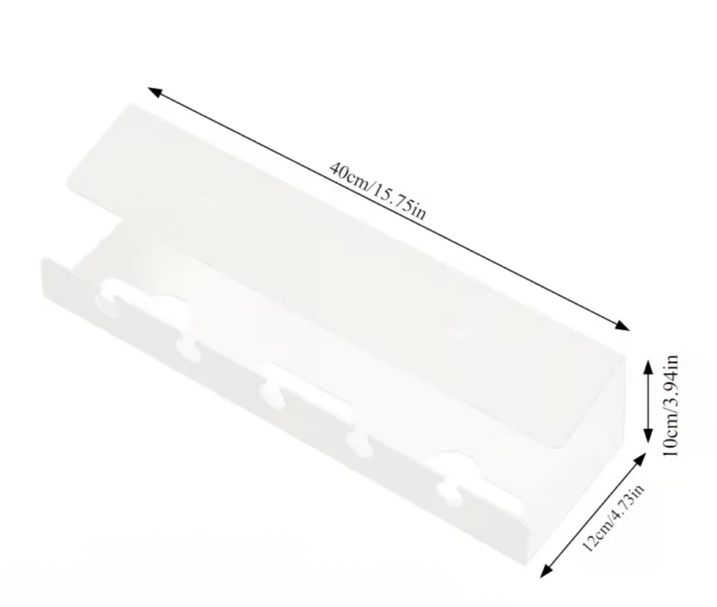 This is a white under-desk cable management holder. It's made of metal and measures 40cm long, 12cm deep, and 10cm high. It helps to keep your workspace tidy by organizing cords and power strips. Suitable for home offices or workspaces needing better cable organization.