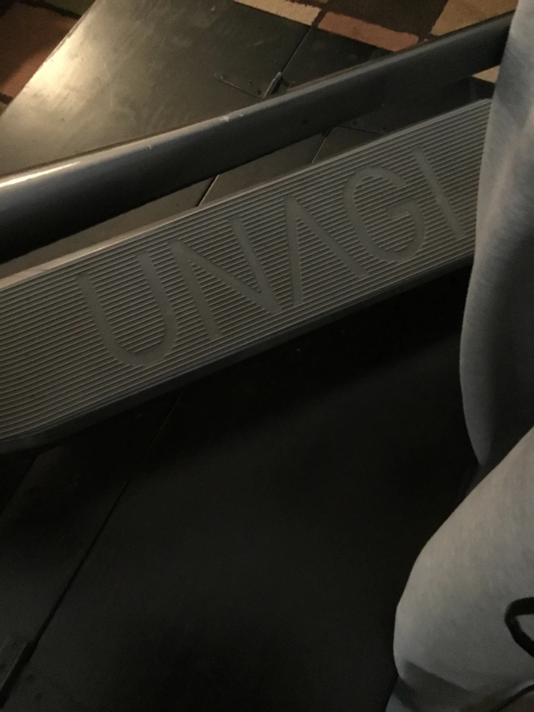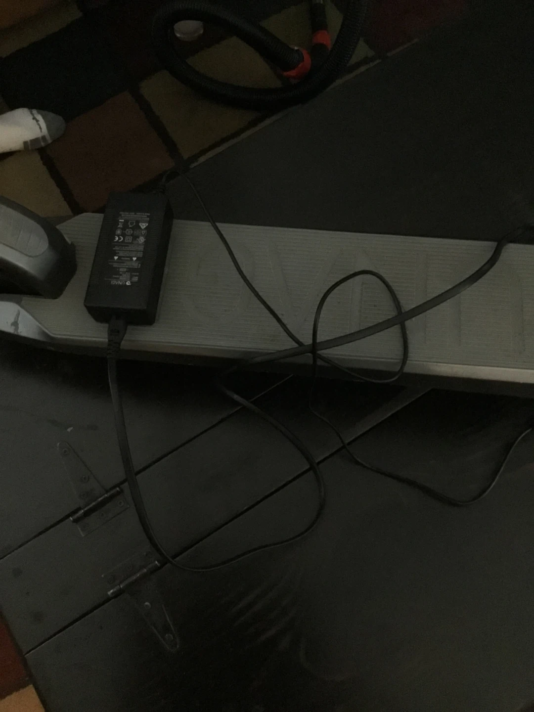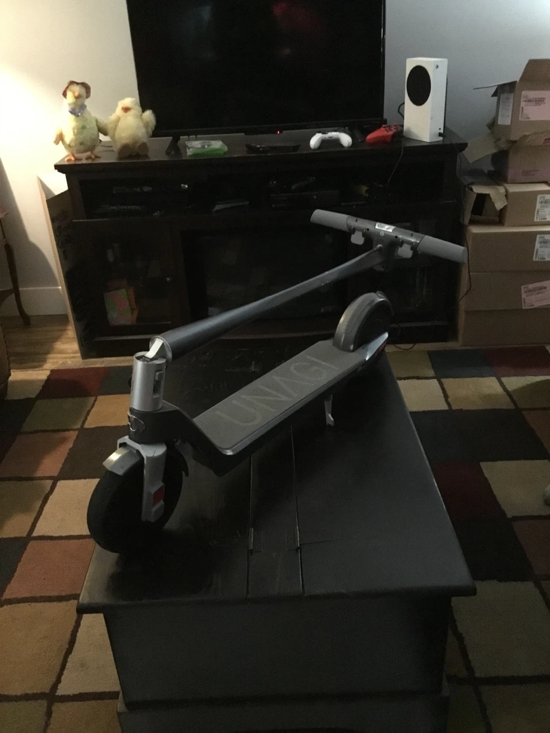 This is a Unagi electric scooter. It's grey with a digital display showing speed and battery level. Features a rear brake light.