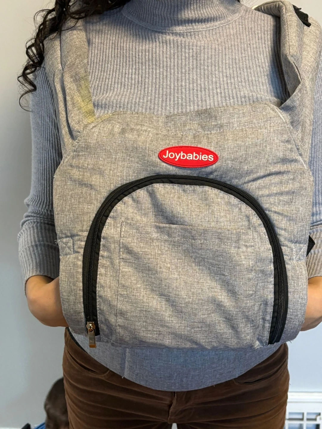 Grey Joybabies baby carrier with adjustable straps. It's made of a soft, durable fabric. Features a zippered pocket on the front.