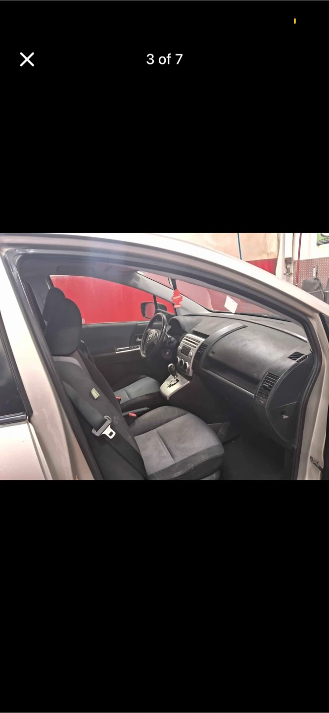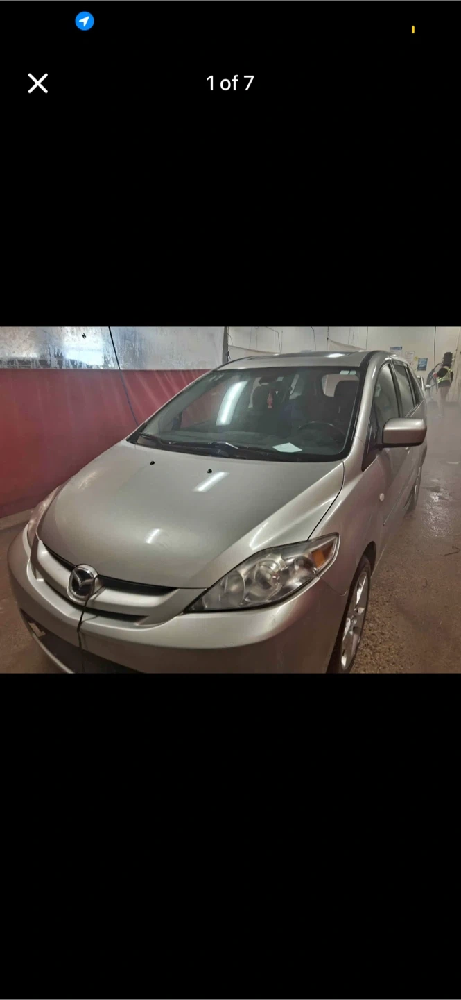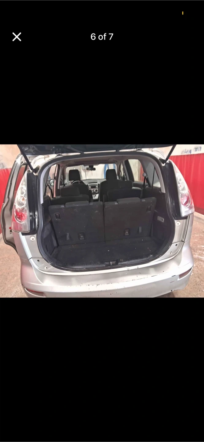 Silver Mazda 5 van with black interior seating. Seats up to seven people. It's a practical vehicle for families.