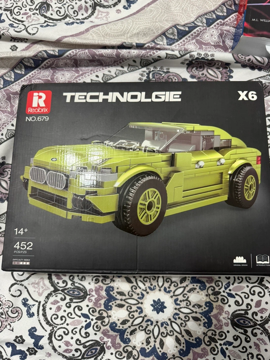 This is a Reobrix Technic X6 building block set. It's a 452-piece kit recommended for ages 14 and up. The set includes an instruction manual. This model is designed for builders who enjoy intricate vehicle construction.