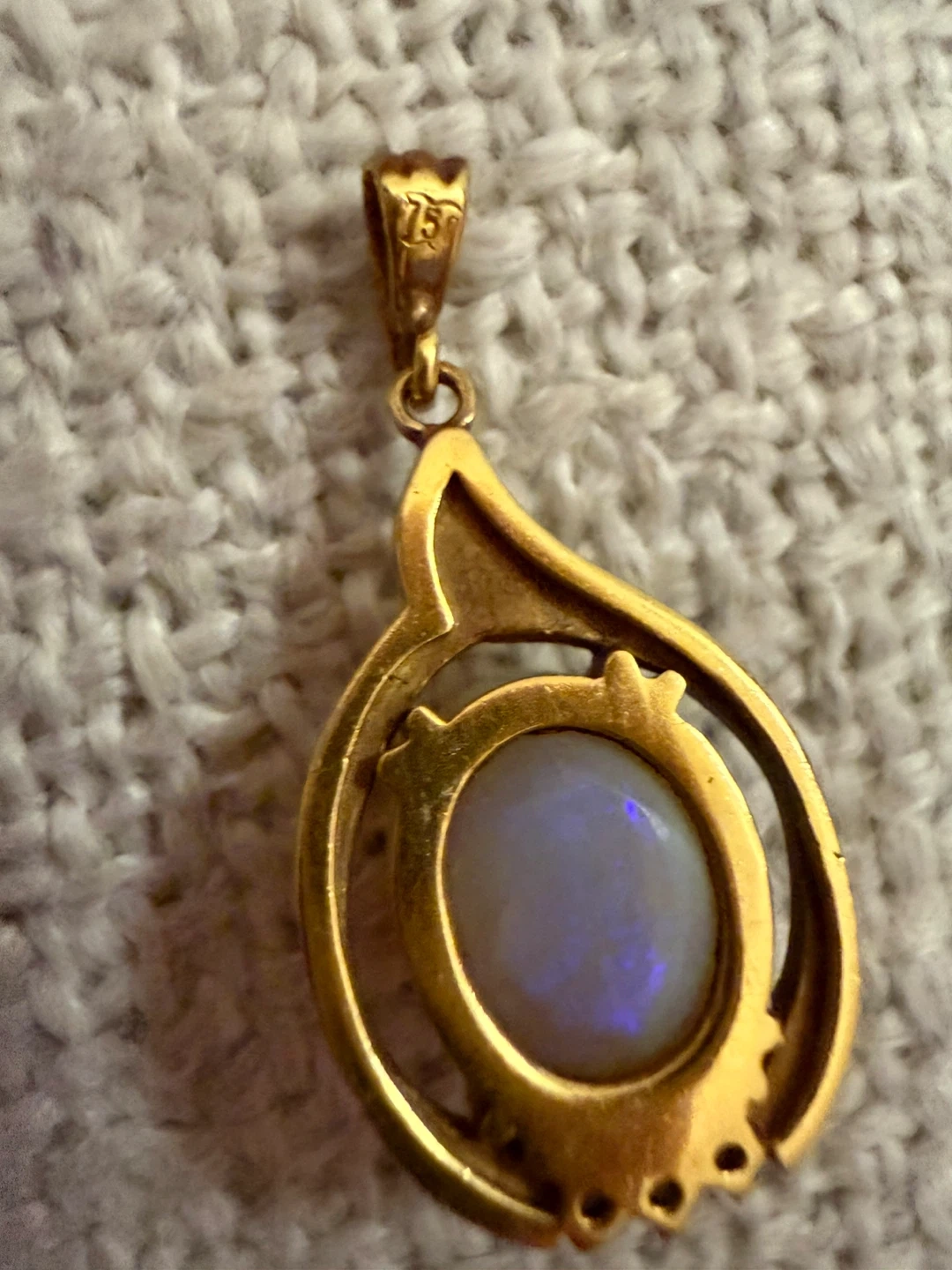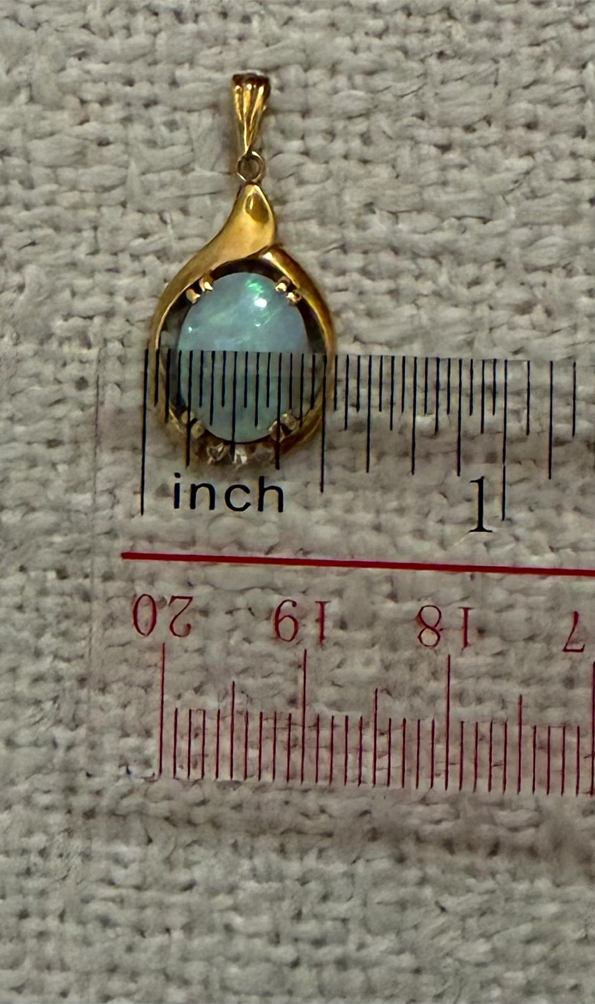This elegant pendant features a luminous opal surrounded by a gold setting. Three small diamonds accent the bottom. Pendant measures approximately 2.5 cm in length.