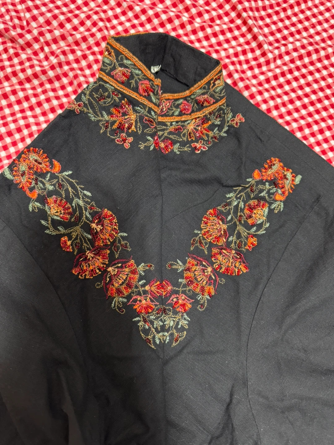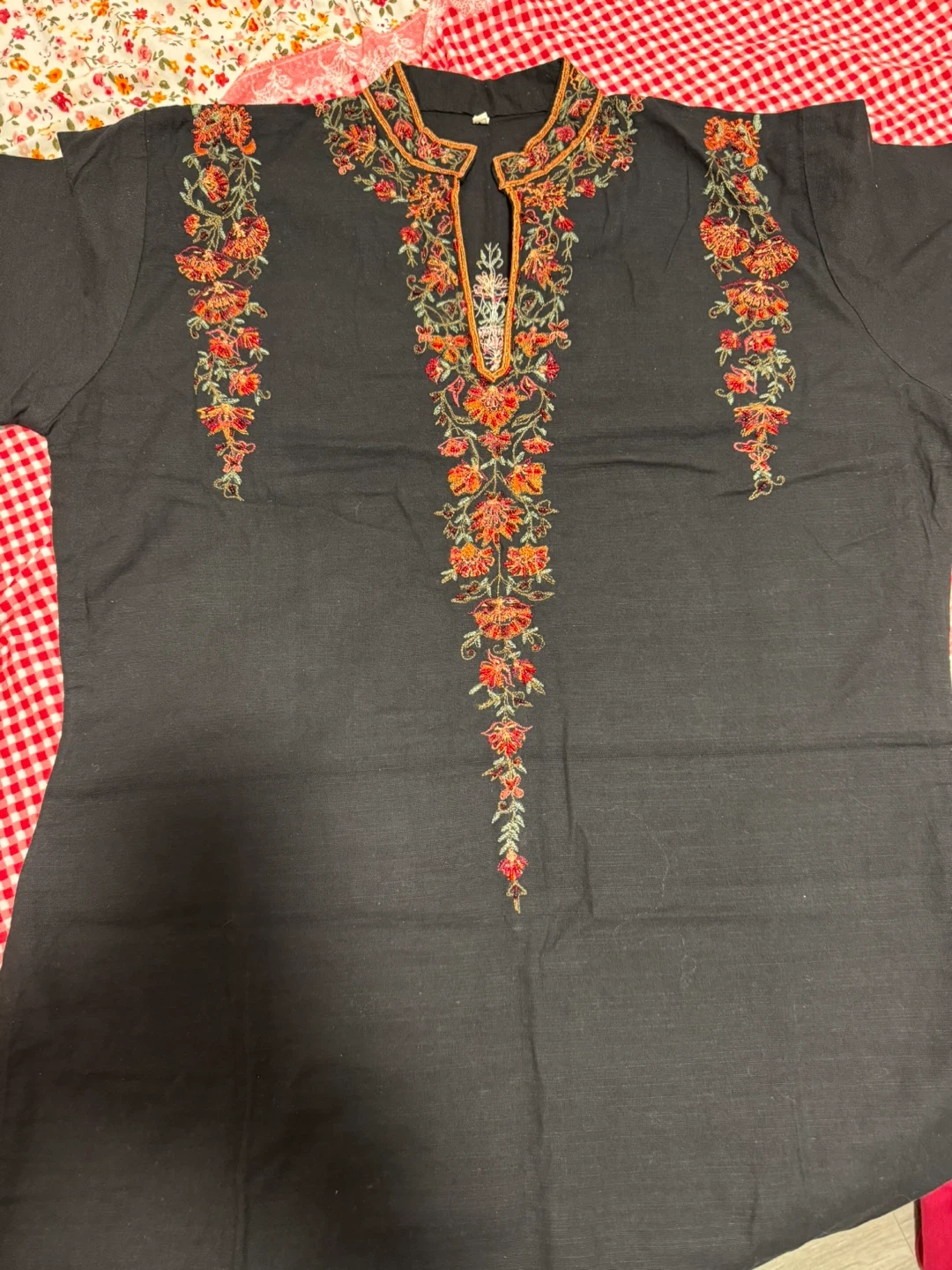 This black kurti with dupatta and pant features intricate floral embroidery around the neckline, down the front, and on the sleeves. It's made of a lightweight fabric, perfect for warmer weather. The matching pants and dupatta are included.