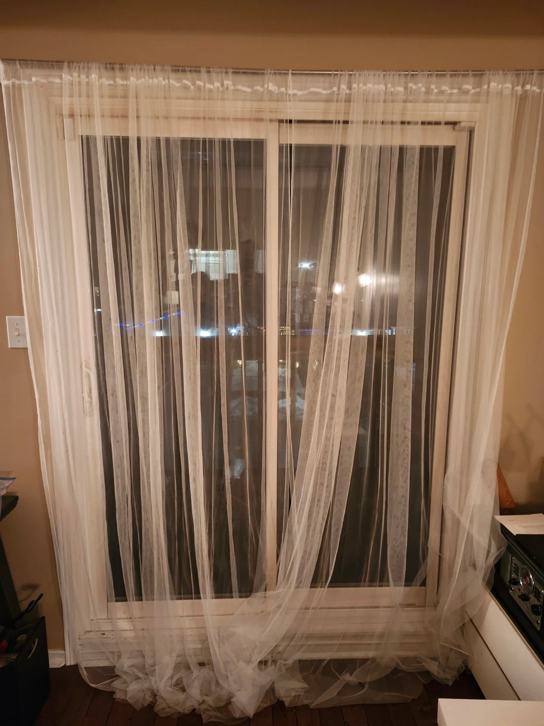 Selling a white sheer curtain panel. It's in great condition and would be perfect for adding a light and airy touch to any room. The material is lightweight and flows nicely.