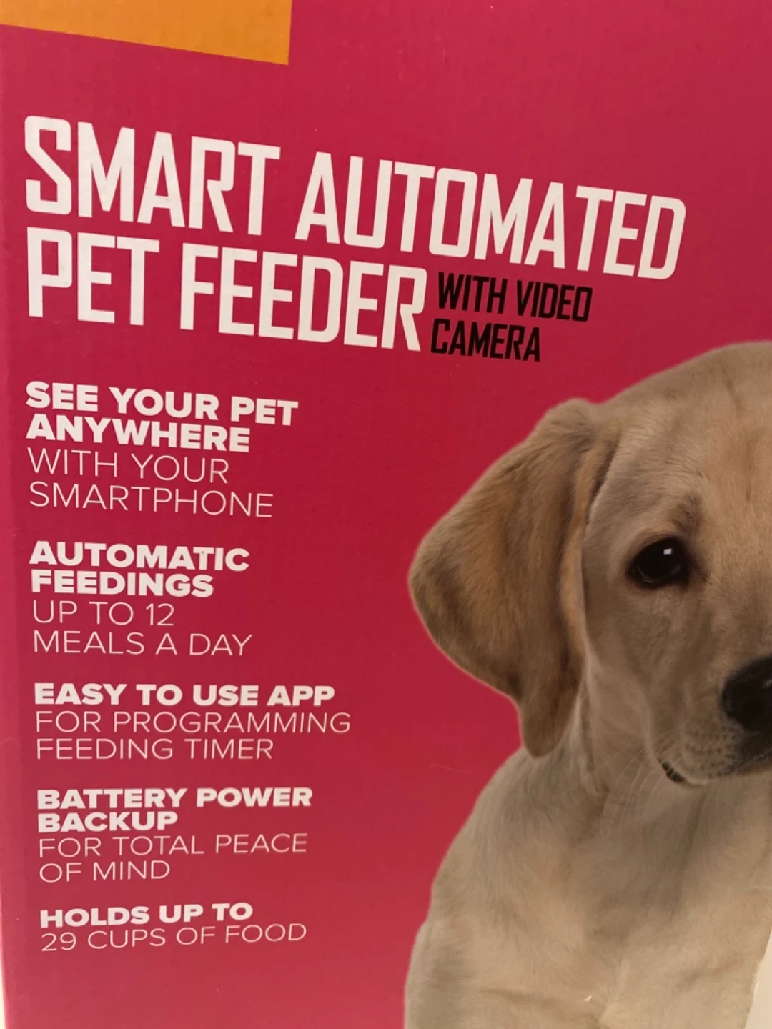 This smart feeder lets you schedule automatic feedings up to 12 meals a day. See your pet anywhere with its built-in camera and two-way audio. It holds up to 29 cups of food and has battery power backup. Material is ABS plastic.
