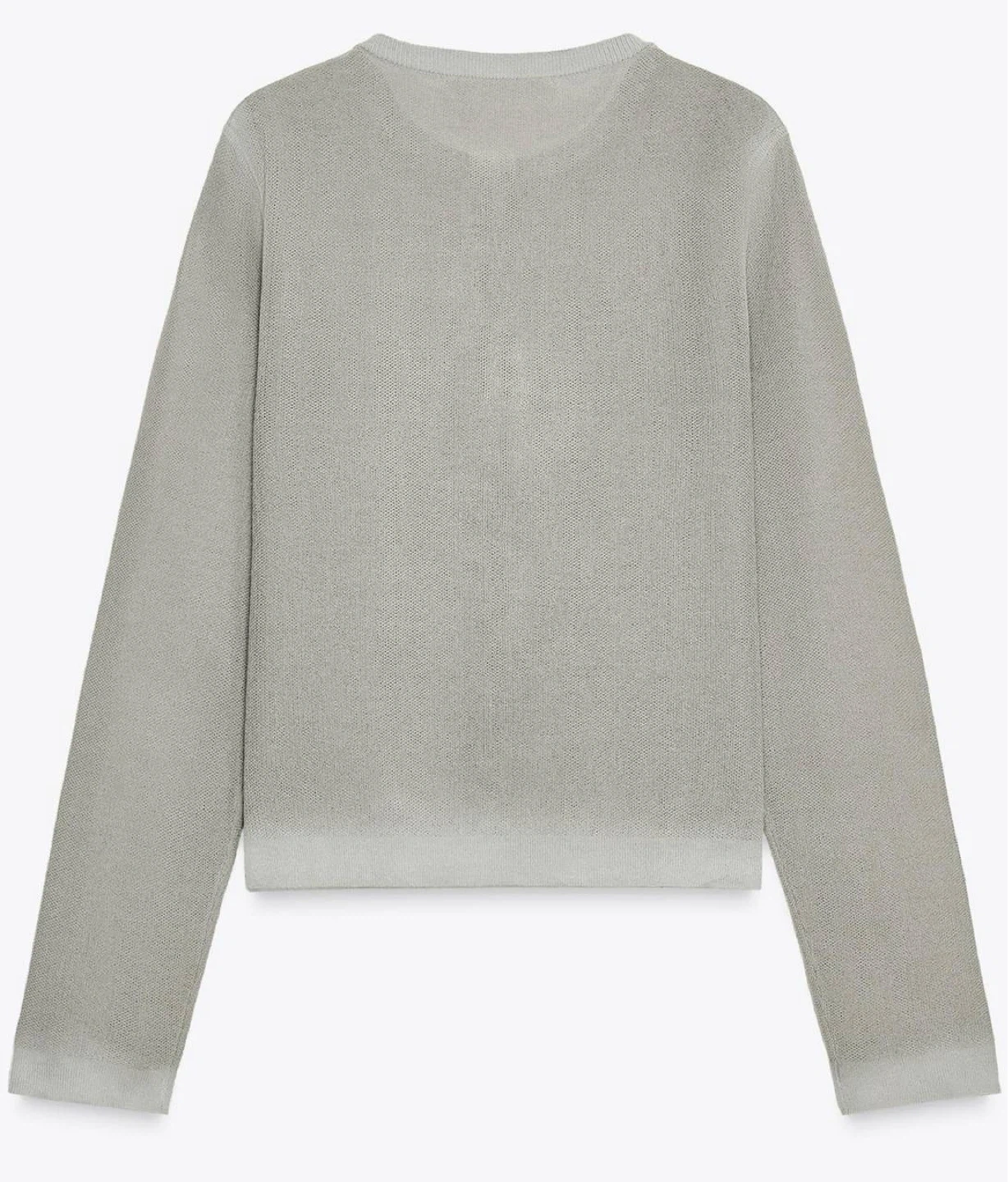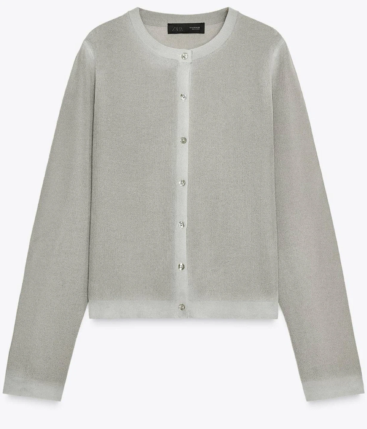 Elegant round-neck cardigan with long sleeves and a soft gradient effect. Features a front button closure and a lightweight knit that’s perfect for layering or wearing on its own.
