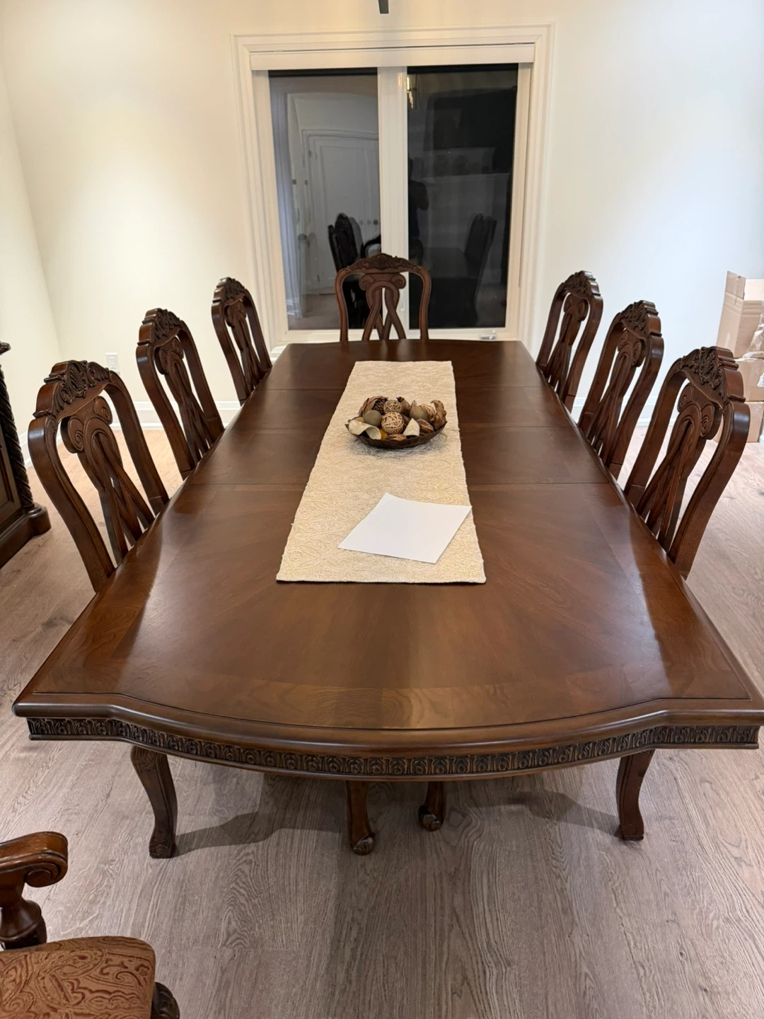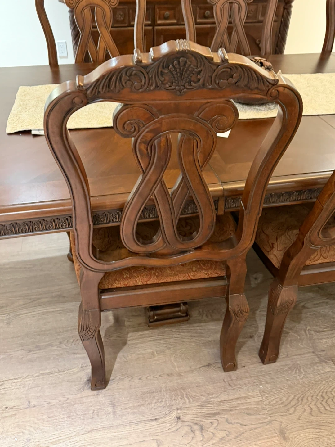 This is a complete dining room set featuring a large wooden table, eight chairs with upholstered seats, and a matching china cabinet with glass doors. The furniture is made of dark wood with intricate carvings. It's perfect for hosting family dinners or elegant gatherings.