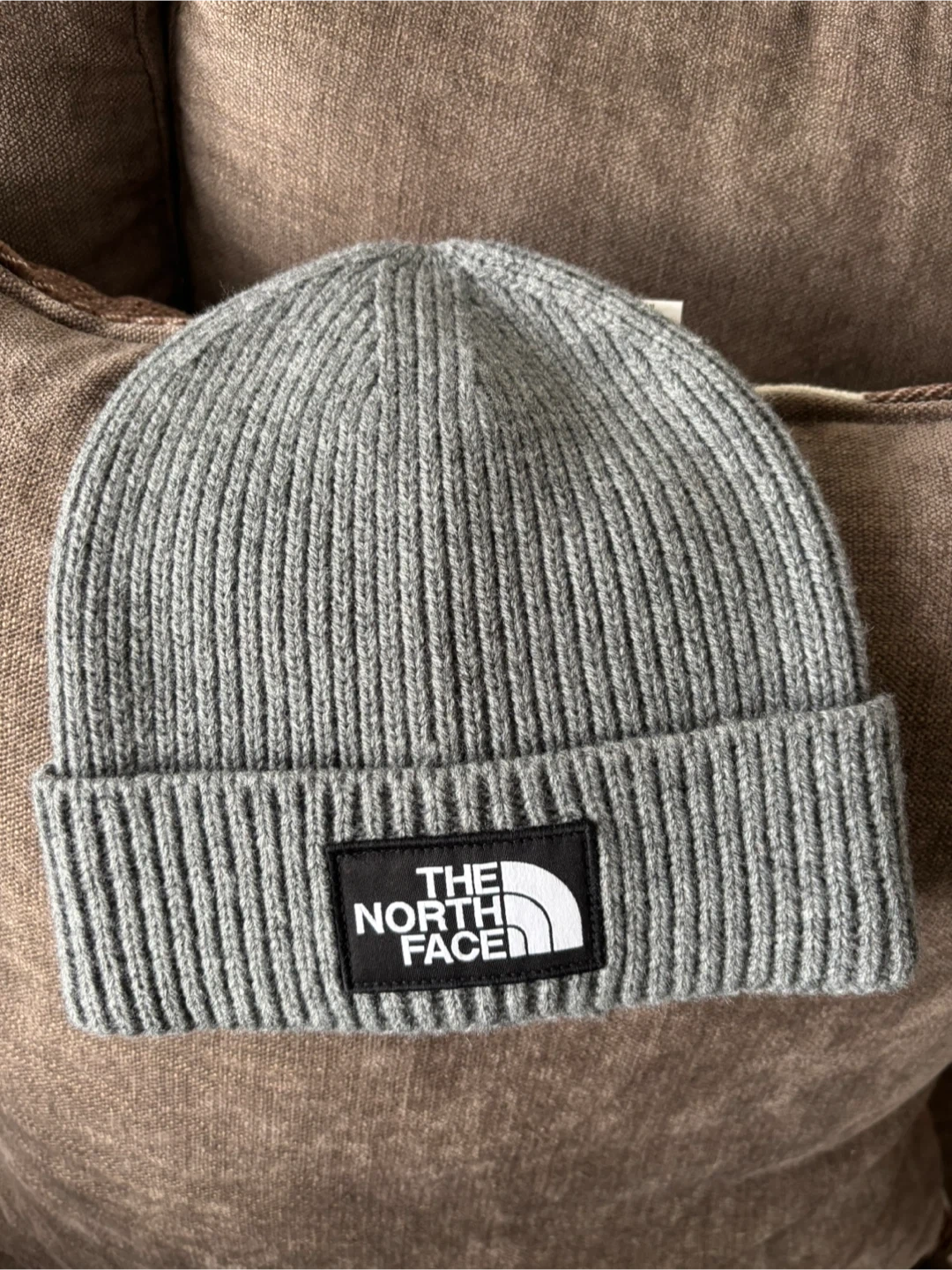 This is a grey ribbed beanie from The North Face. It's made of a knit material.