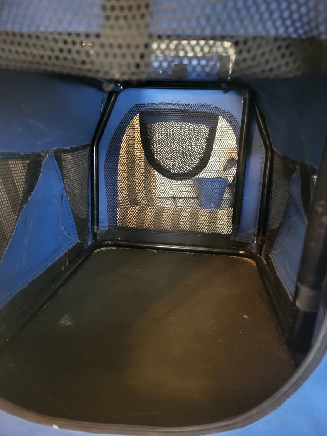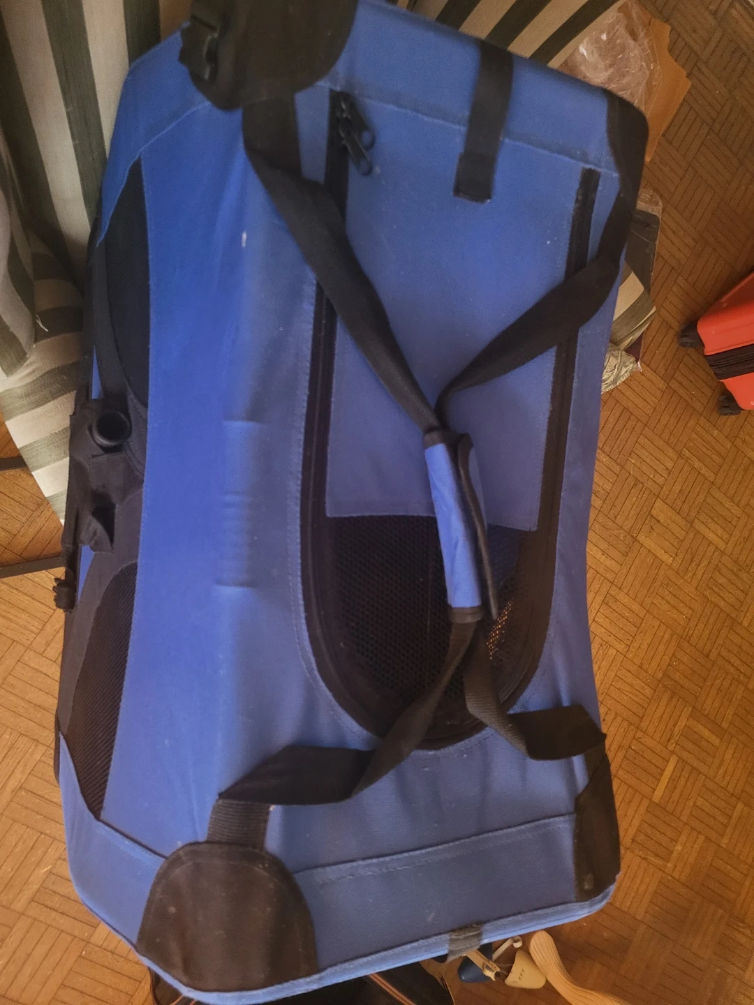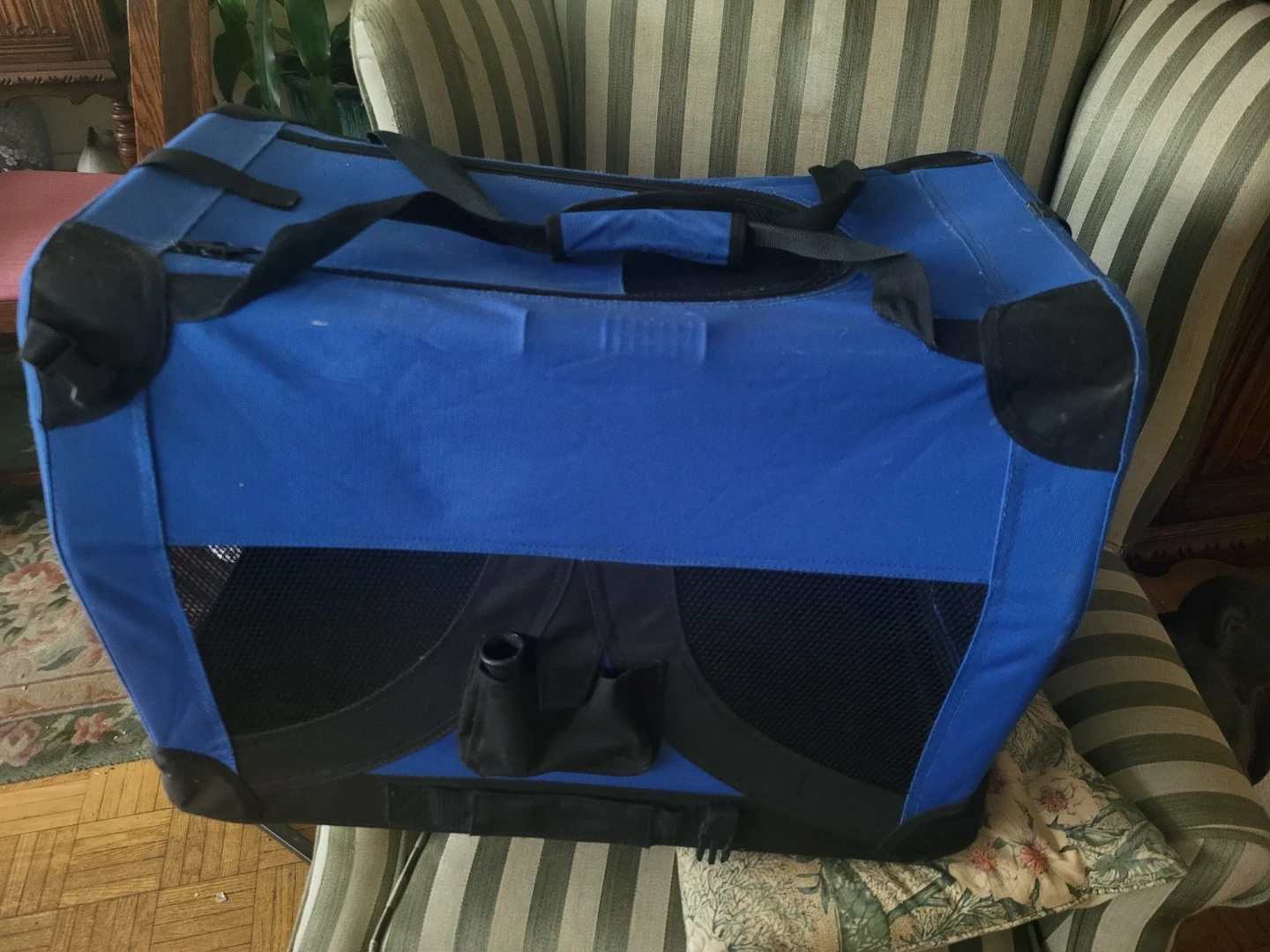 Selling a blue pet carrier! It's in good condition and ready for your furry friend's next adventure. It has black accents and mesh windows for ventilation