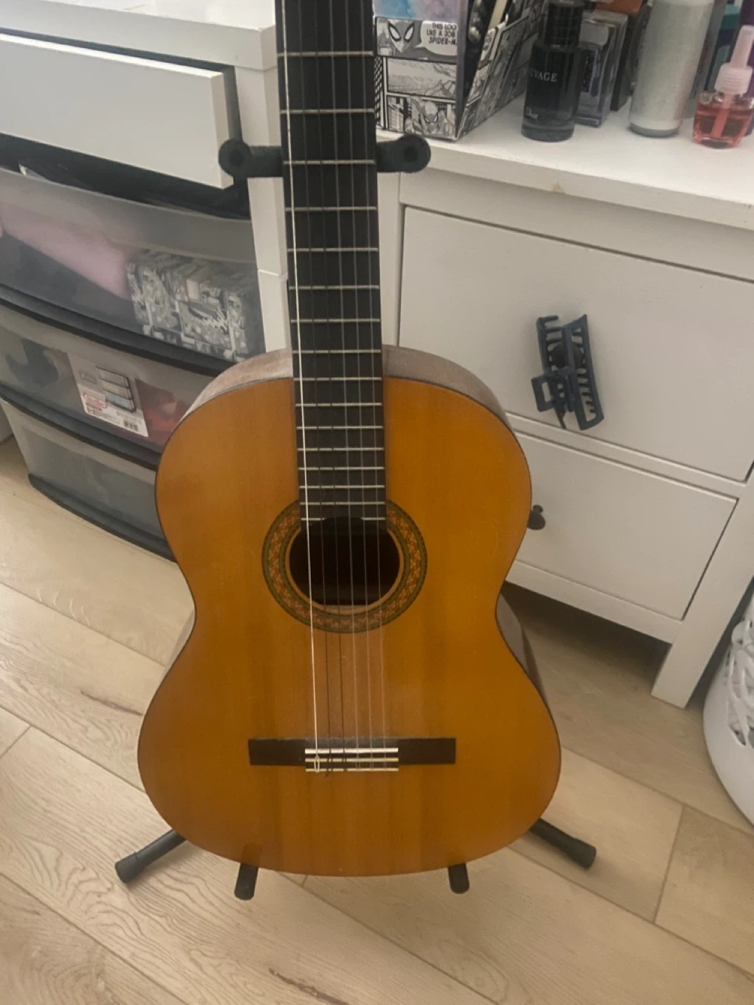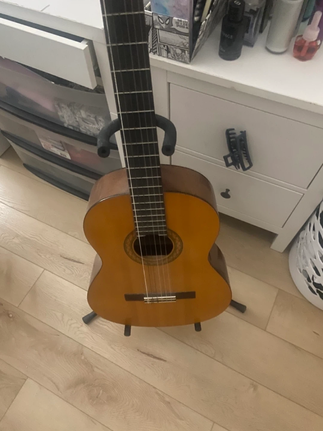 This is a classic acoustic guitar with a warm, natural wood finish. It features nylon strings, making it comfortable for beginners. Great for learning your favourite tunes!