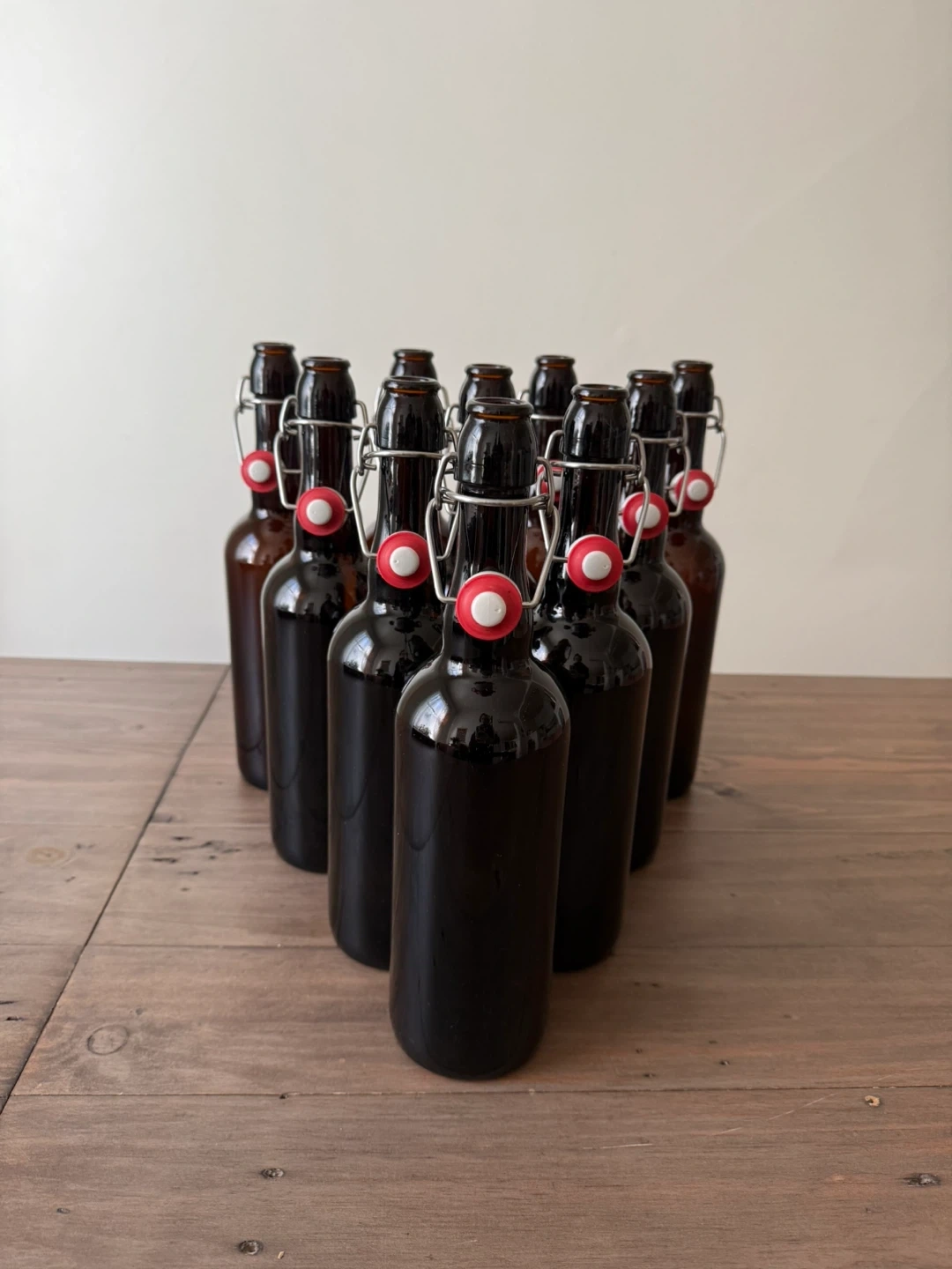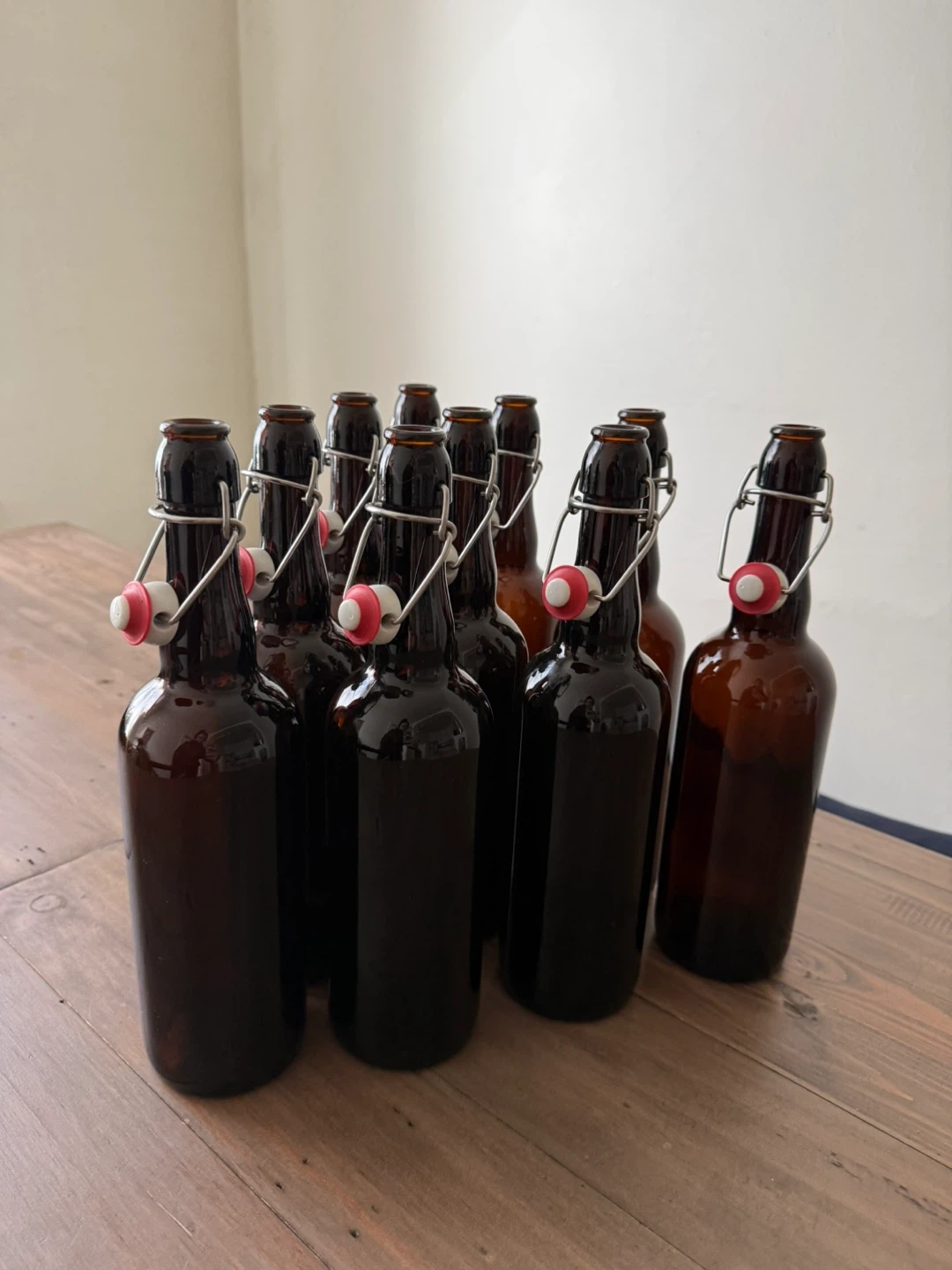 Set of ten (10) brown glass pop-top bottles that hold 750mL perfect for at-home brewing, kombucha, syrups, and the like.