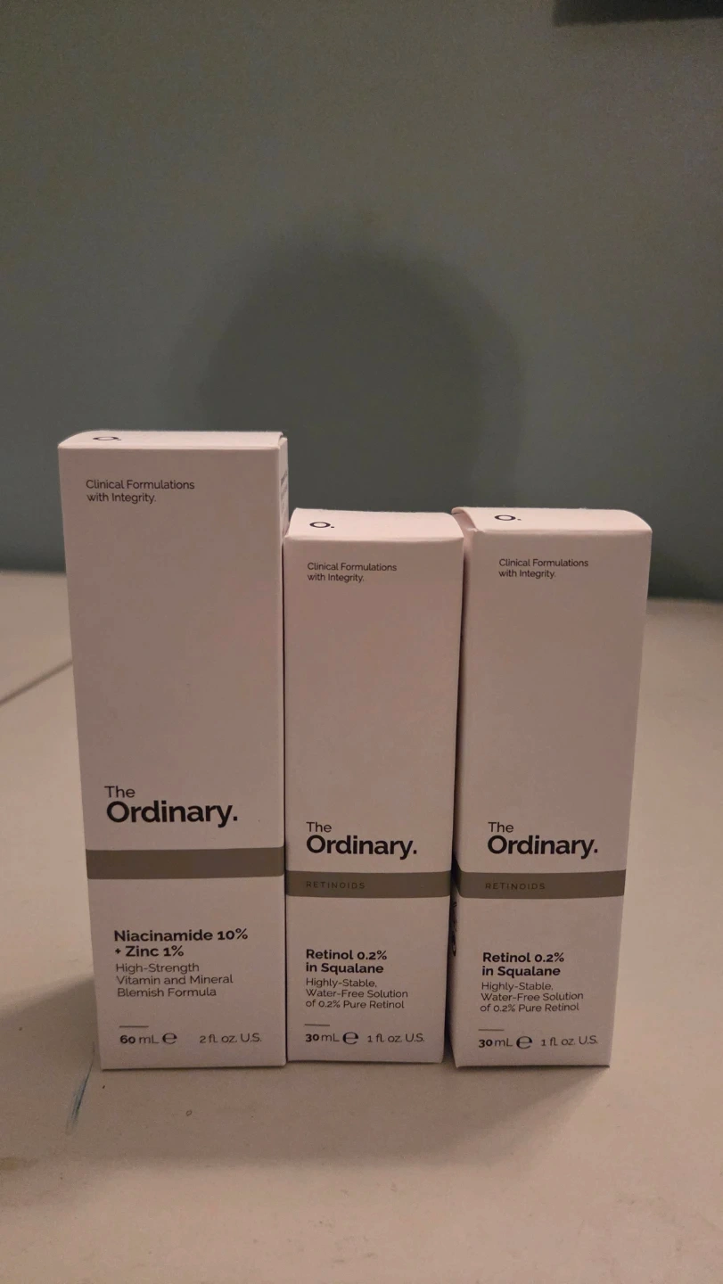 I have The Ordinary Niacinamide 10% + Zinc 1% (60ml×1) and The Ordinary Retinol 0.2% in Squalane (30ml×2) available.