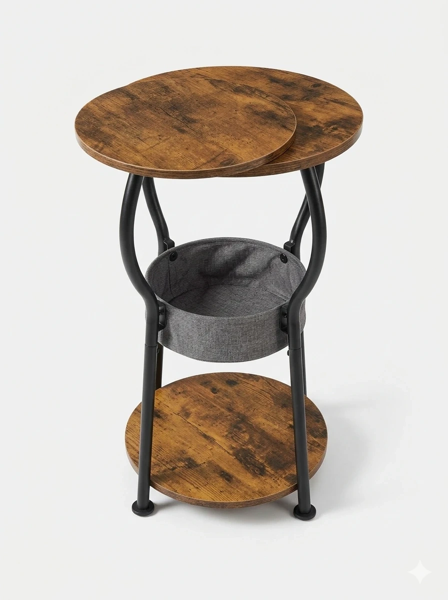 Round end table featuring a rustic wood-look top and a lower shelf. Includes a grey fabric storage basket. Its metal frame provides sturdy support.