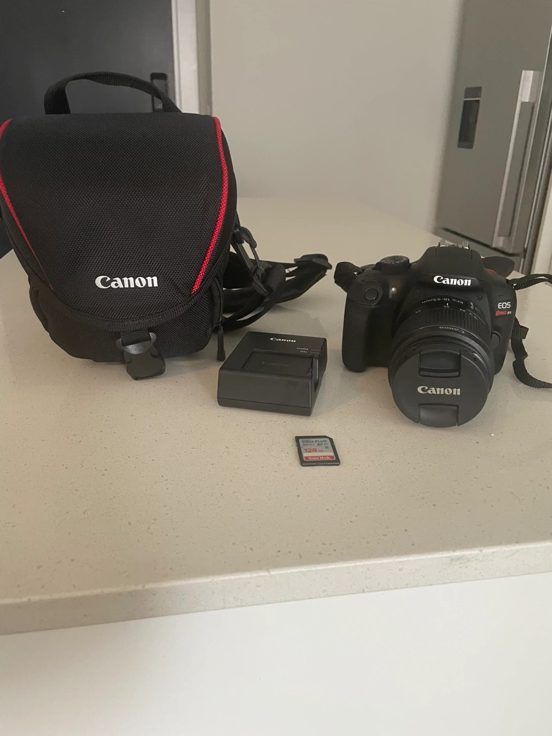 Canon EOS Rebel T7 DSLR camera. Comes with a Canon camera bag, battery charger, and a SanDisk SD card. This kit is ready for your next photo adventure!