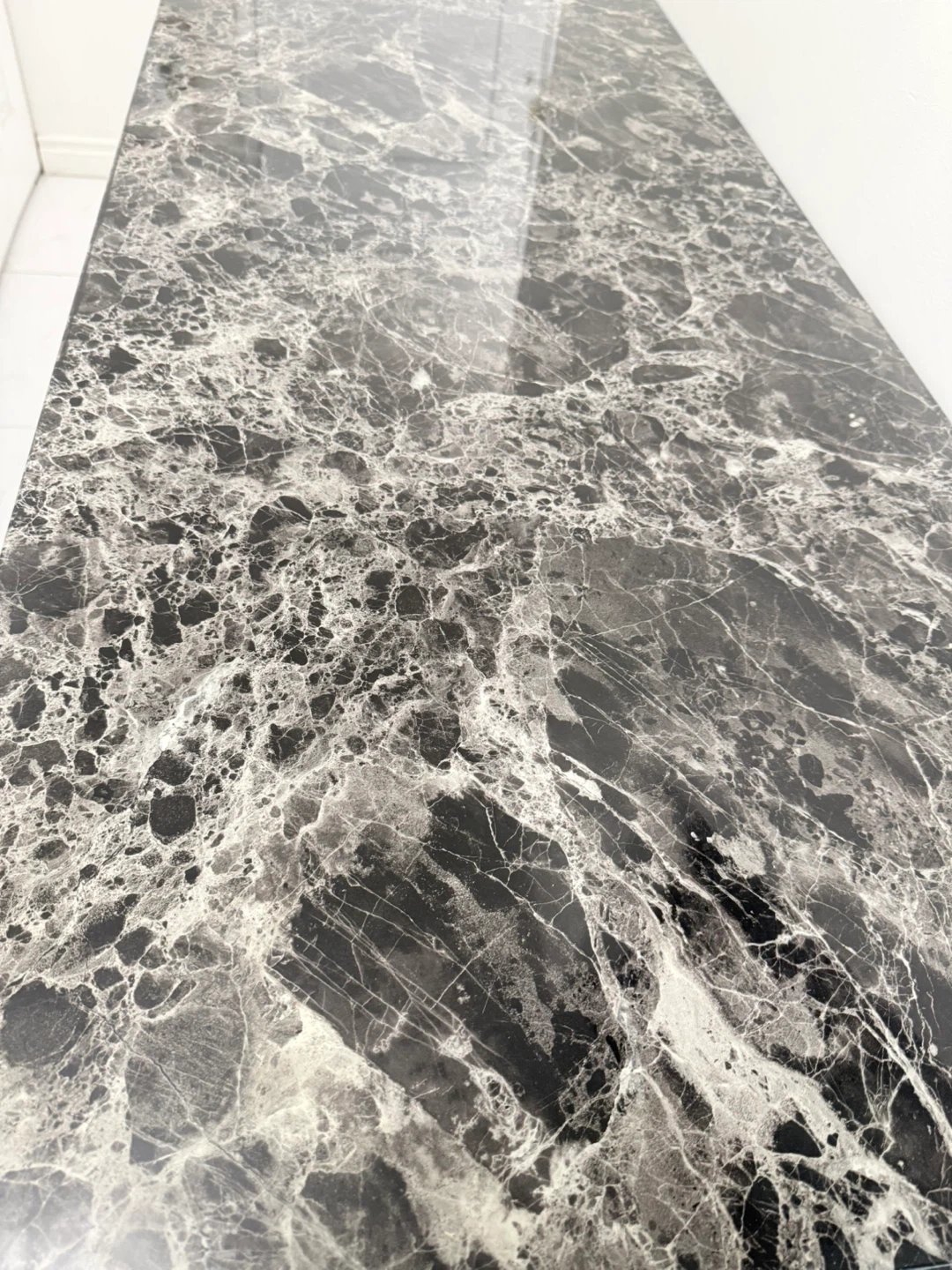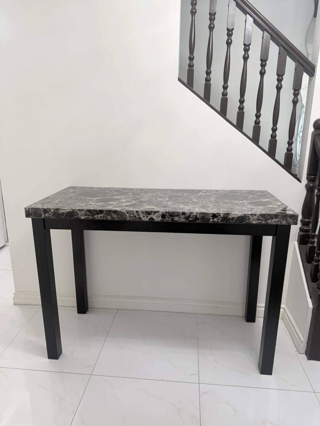 This console table features a black marble-look top and black legs. It's a stylish piece for your entryway or living space. Perfect for holding keys or decorative items!