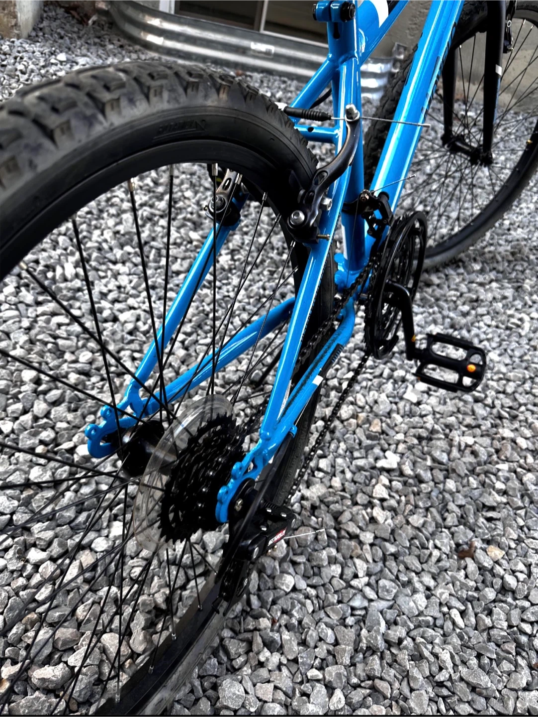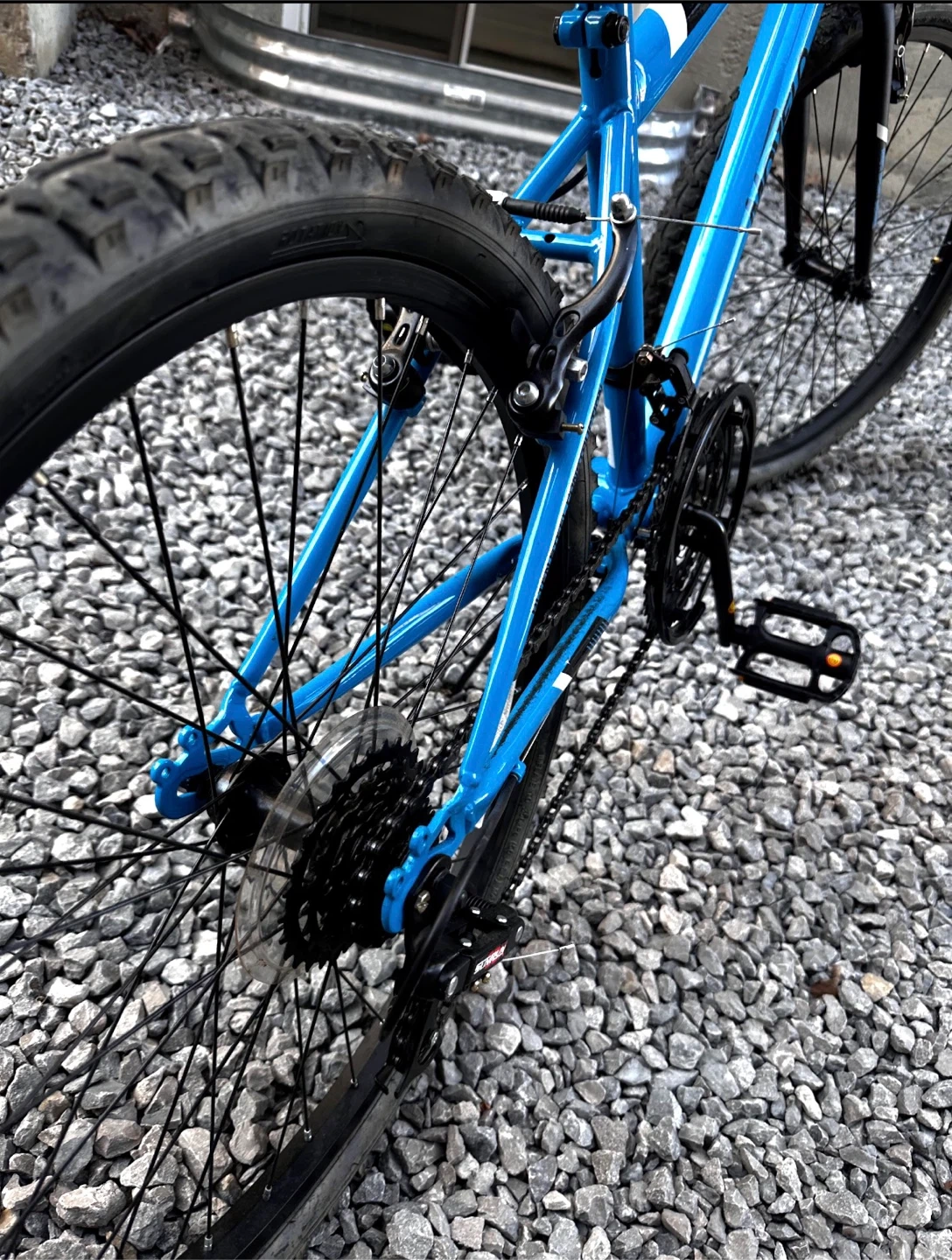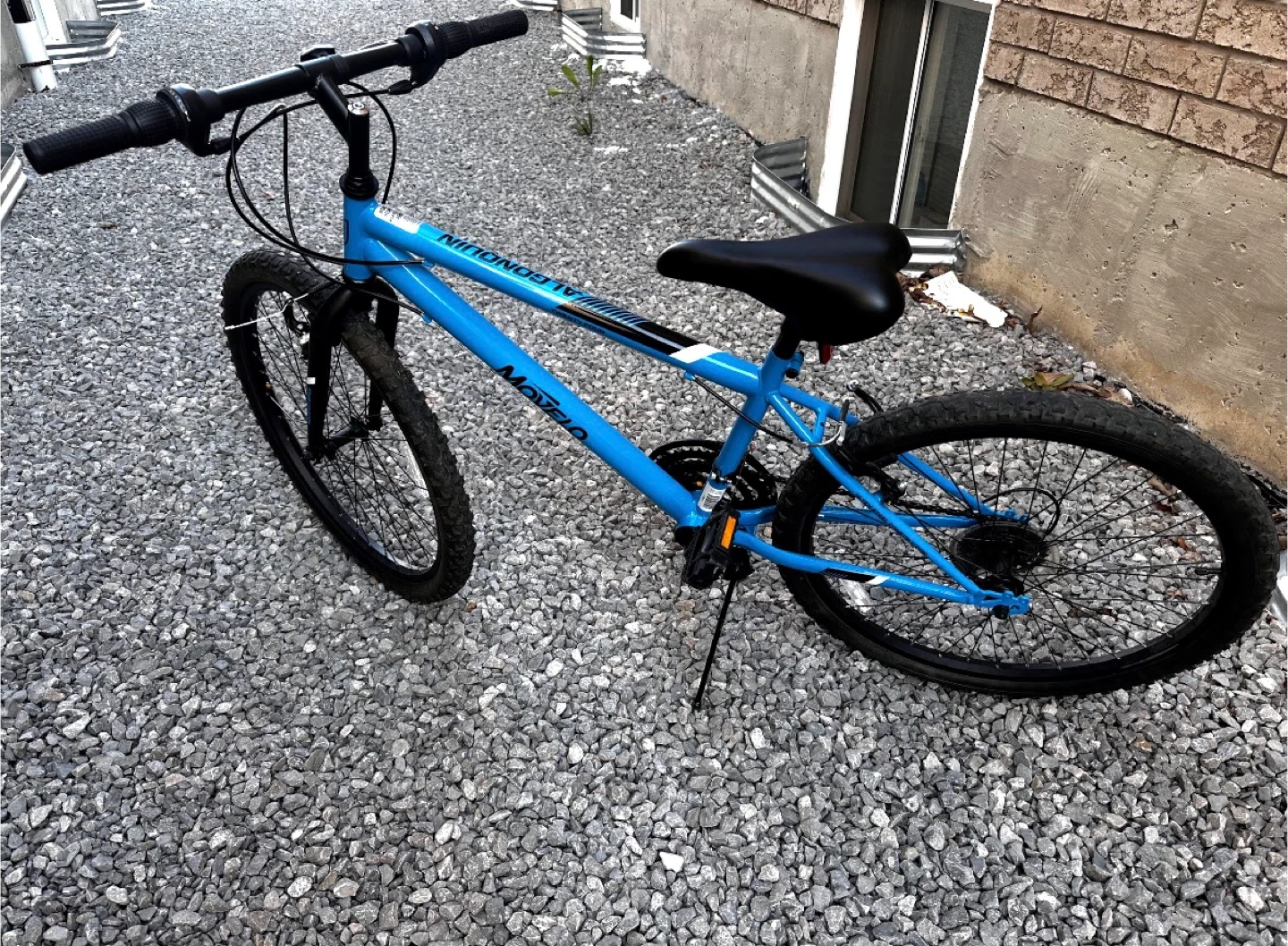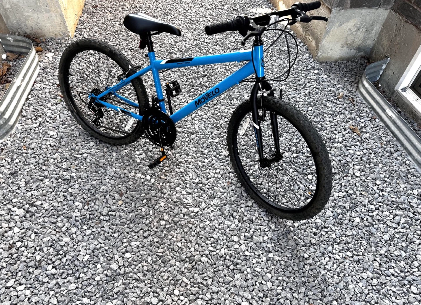 This is a blue Movelo mountain bike with a 24-speed drivetrain. It features front suspension and disc brakes for reliable stopping power. It's a sturdy bike ready for trails or commuting!