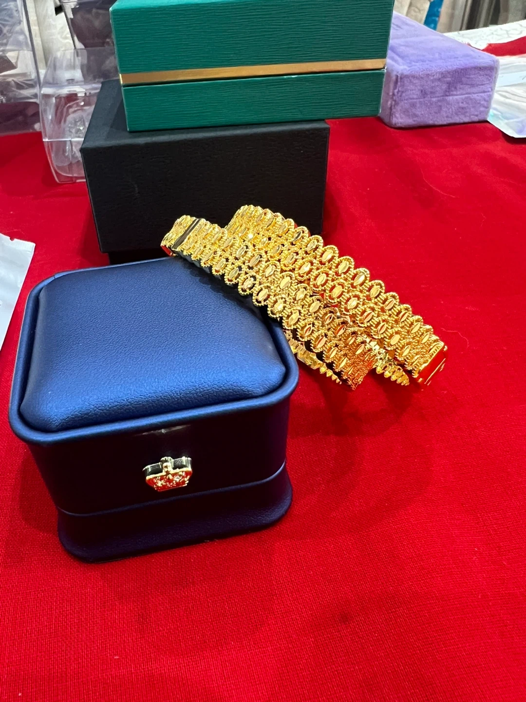 Beautiful gold-plated bracelet with an intricate oval link design. It comes with a navy blue velvet jewelry box, perfect for safekeeping or gifting! This bracelet adds a touch of elegance to any outfit.