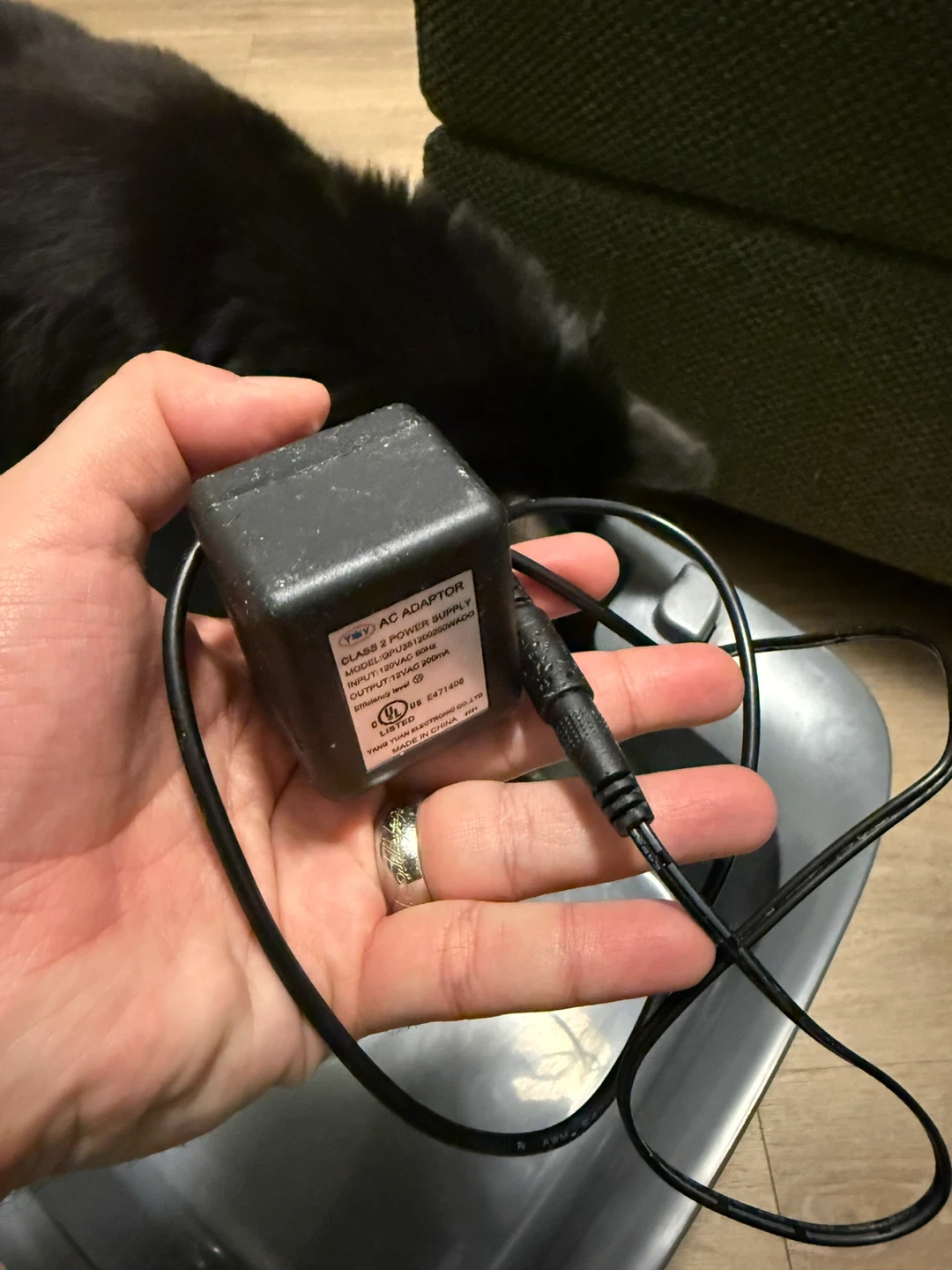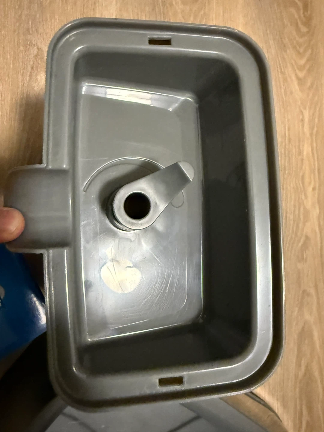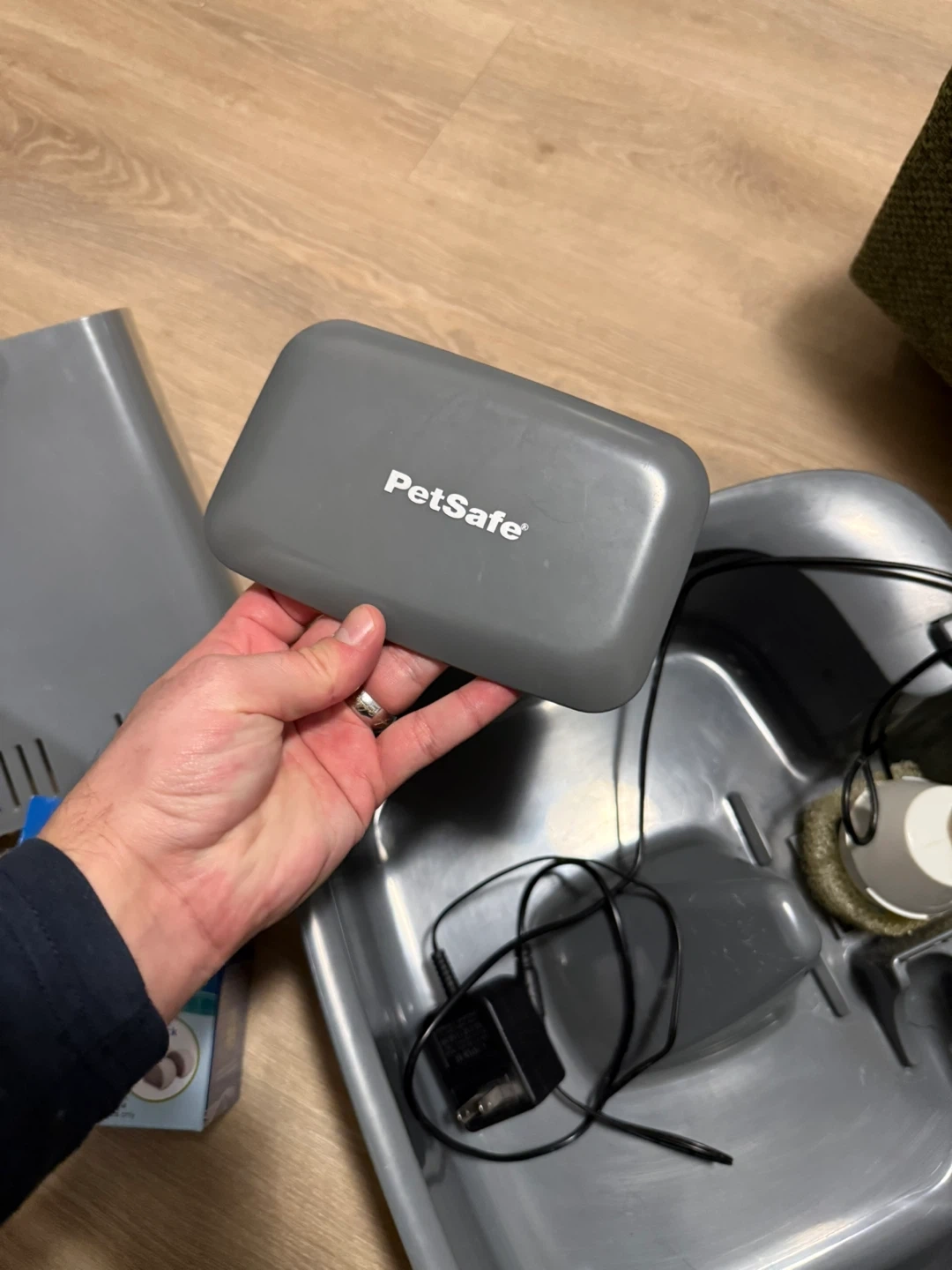 This is a grey plastic PetSafe Drinkwell pet water fountain. It's a 2-liter capacity model. Includes AC adapter and a pack of replacement filters.