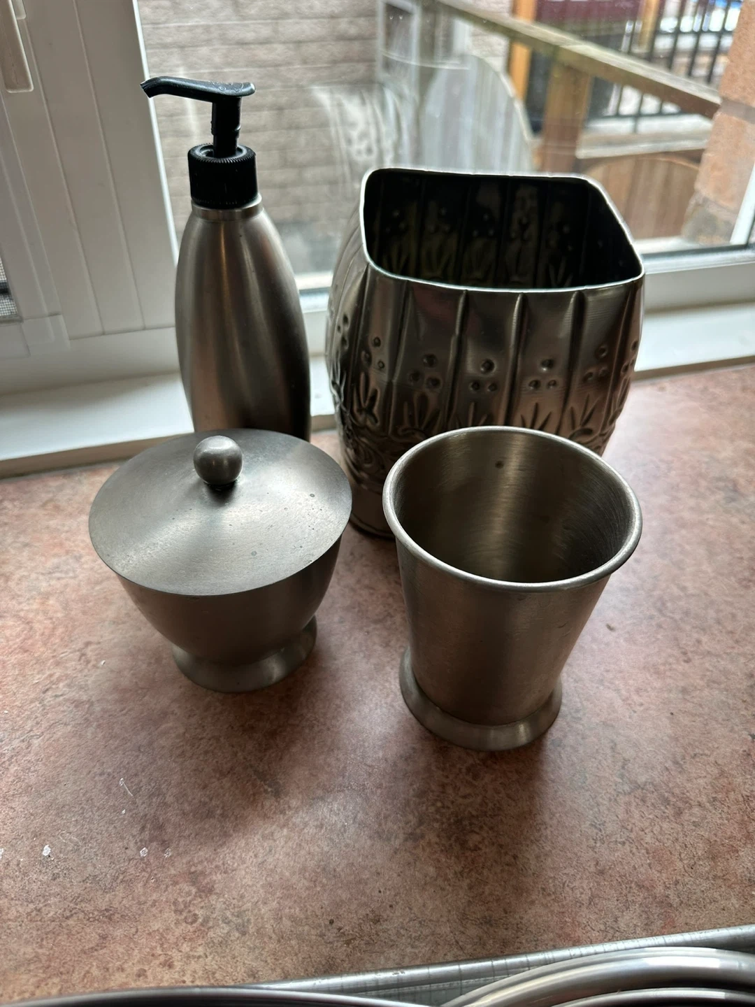 A set of four brushed metal bathroom accessories. Includes a soap dispenser, a covered jar, a cup, and a decorative holder. These items have a classic, ornate design that'll add a touch of elegance to any bathroom.