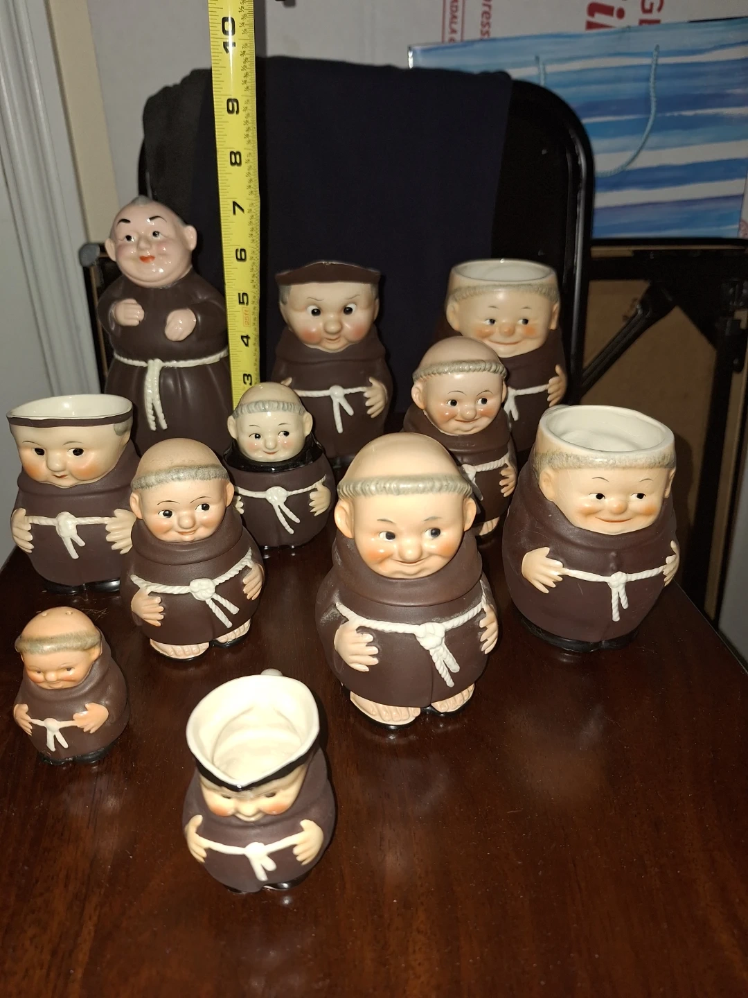 This is a collection of ten Goebel figurines, each depicting a monk. The figurines are ceramic and have a glazed finish. Some are marked with "Made in W. Germany." They come in various sizes, with the tallest measuring approximately 7 inches.