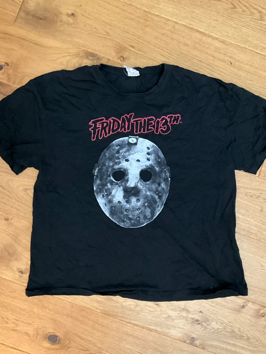 Black t-shirt featuring the iconic "Friday the 13th" logo and Jason Voorhees' hockey mask. It's made of soft cotton for comfort. This tee is perfect for horror movie fans!