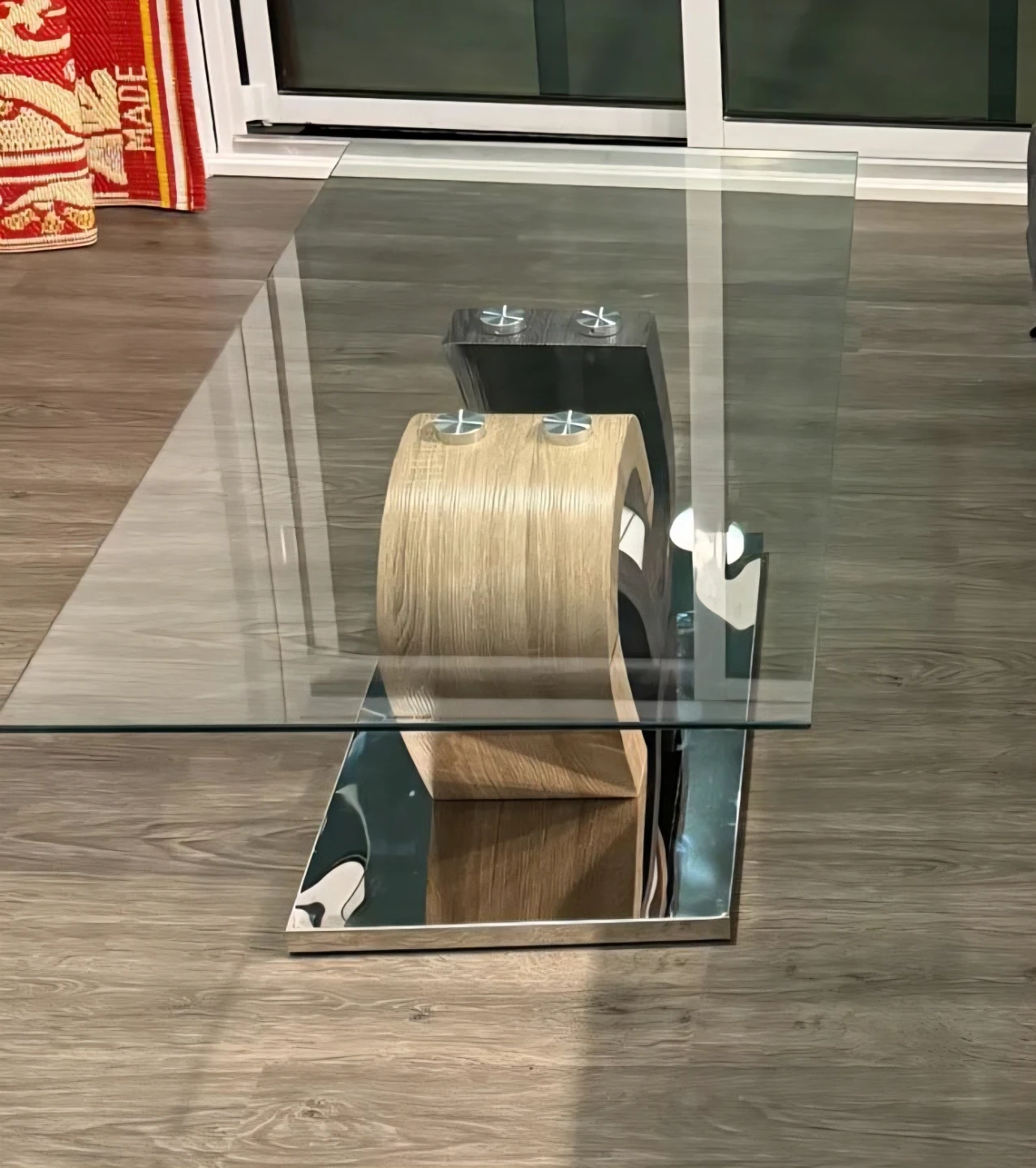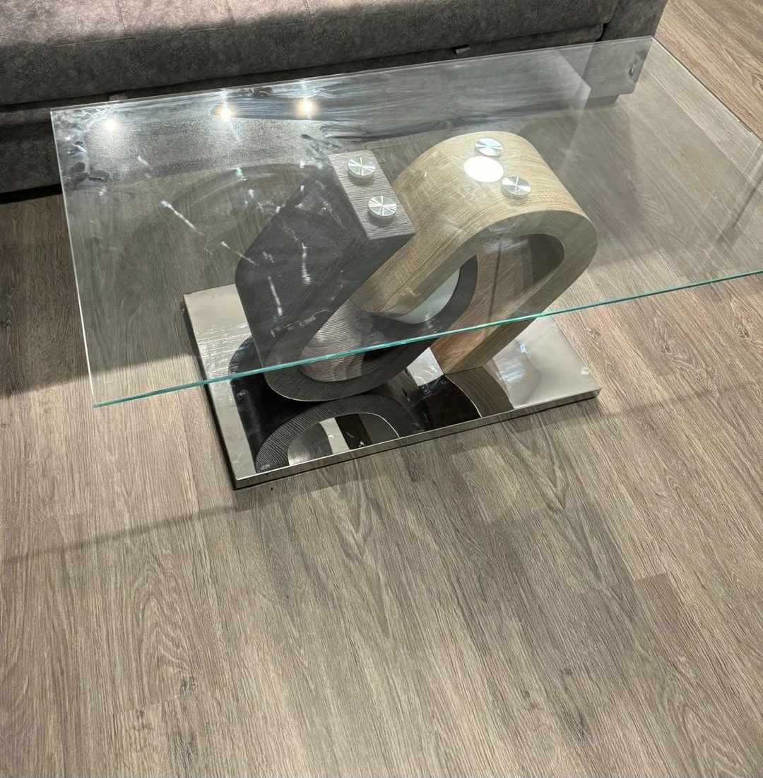 Contemporary coffee table with a clear glass top. It features a unique, sculptural base with mixed wood-look and brushed metal finishes. A stylish addition to any living room!