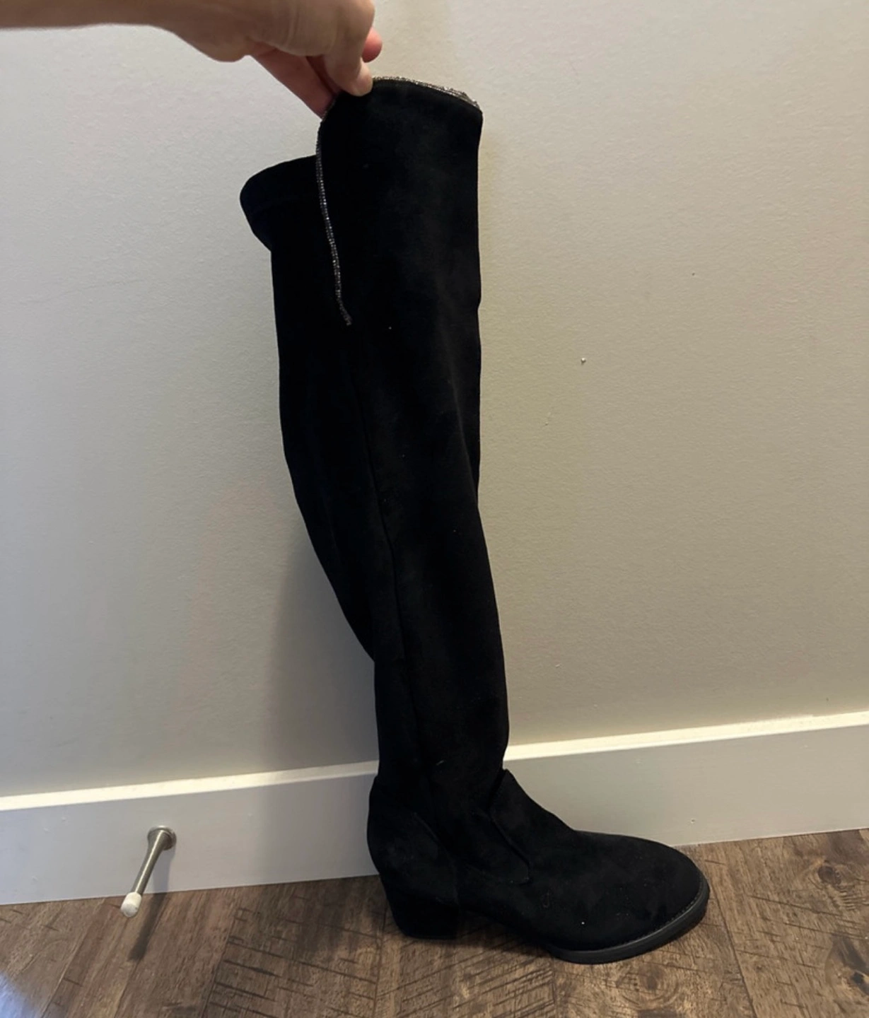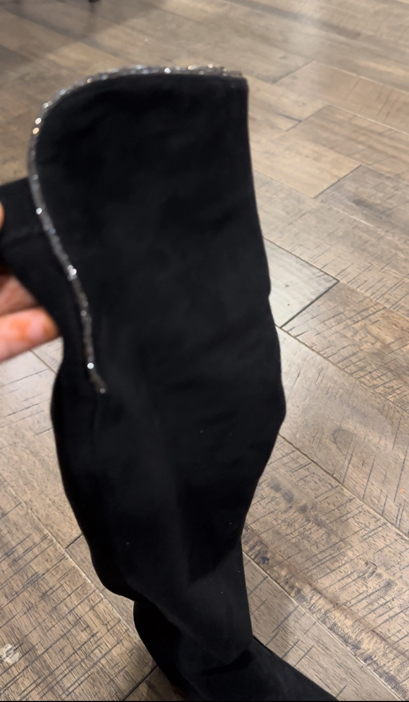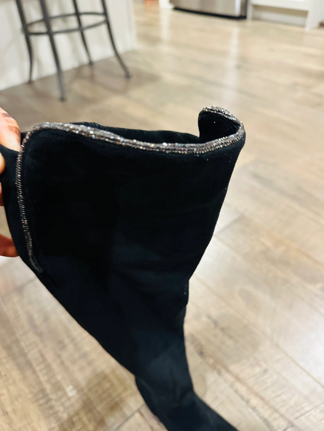Black suede over the knee boots with a low block heel. Rhinestone detail at the top of the boot. Size 7.
