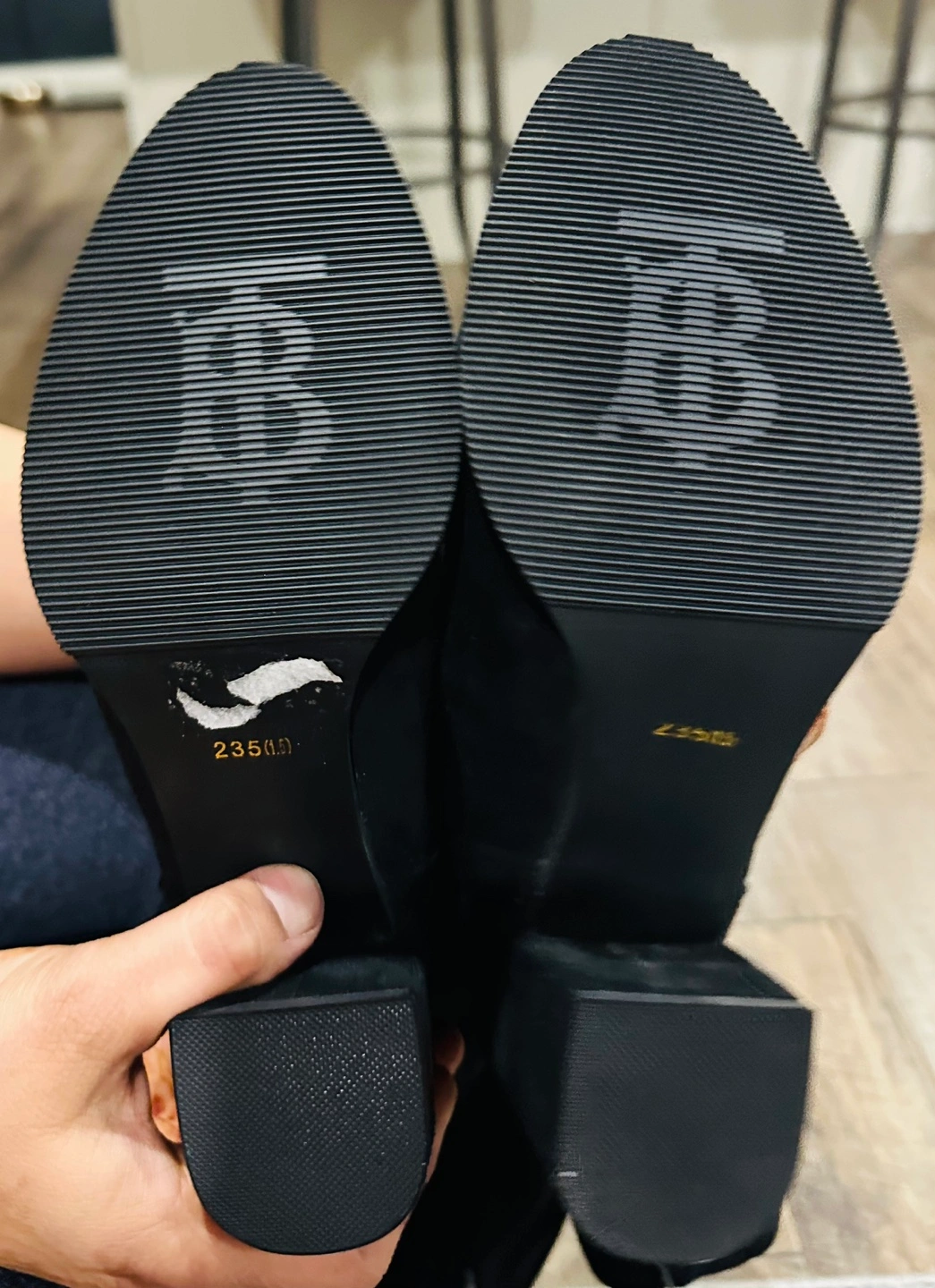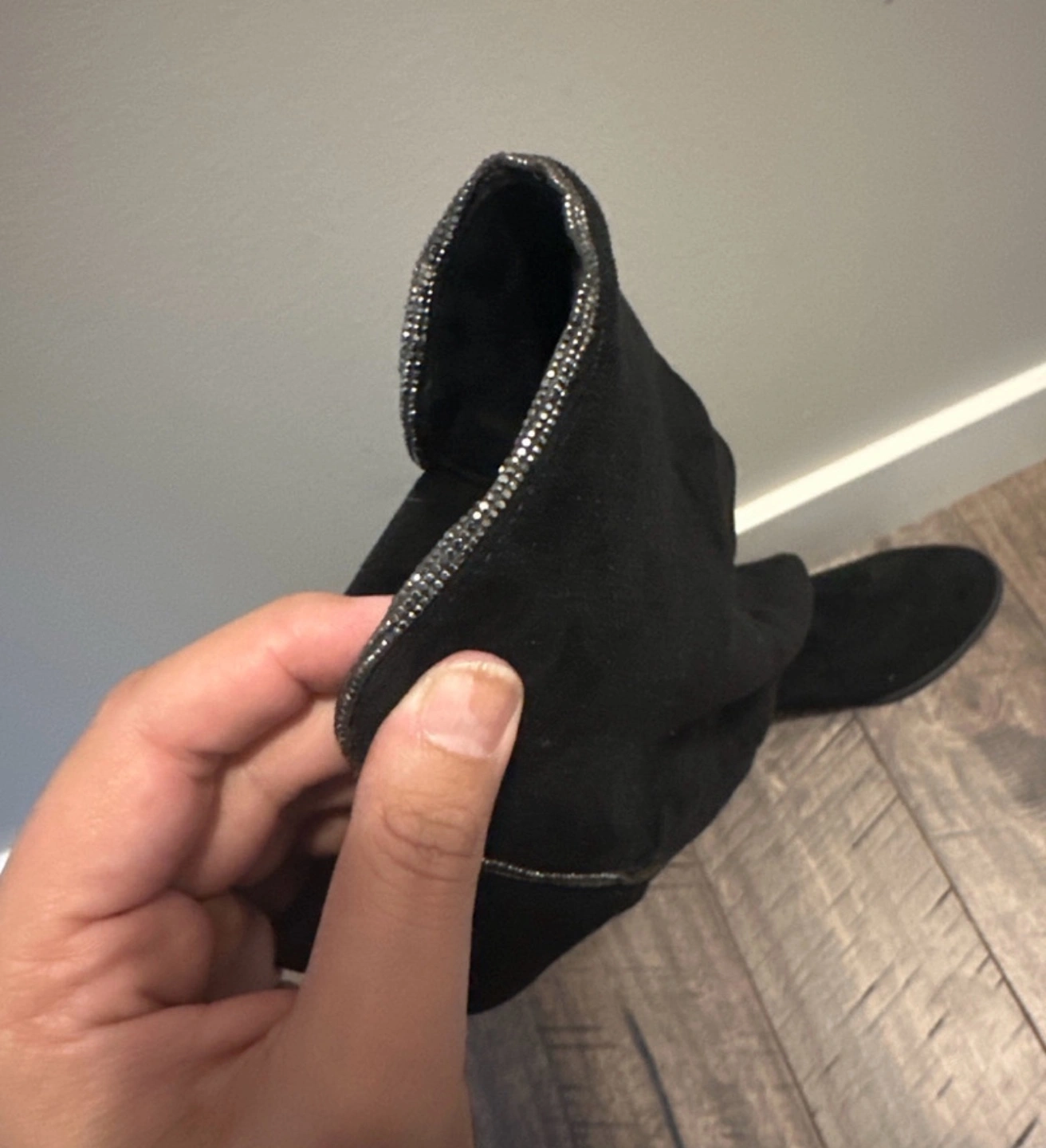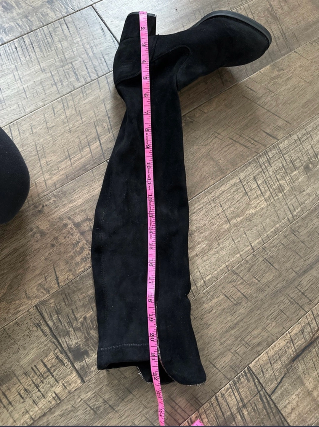 Black suede over the knee boots with a low block heel. Rhinestone detail at the top of the boot. Size 7.