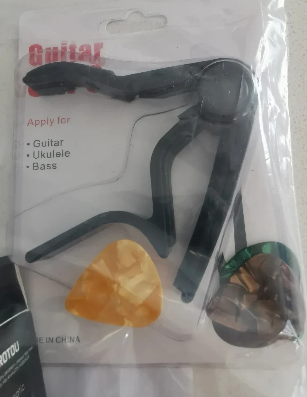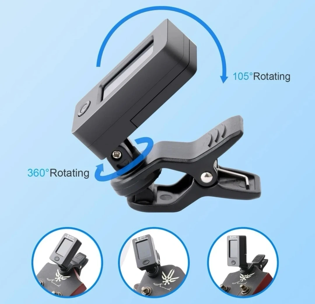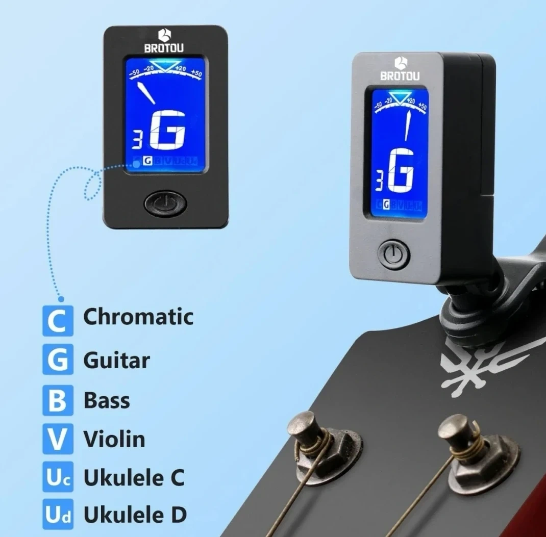 This Brotou clip-on tuner is designed for guitar, bass, violin, and ukulele. It features a 360° rotating head and a 105° rotating display for easy viewing. It can tune to chromatic, guitar, bass, violin, ukulele C, and ukulele D modes.