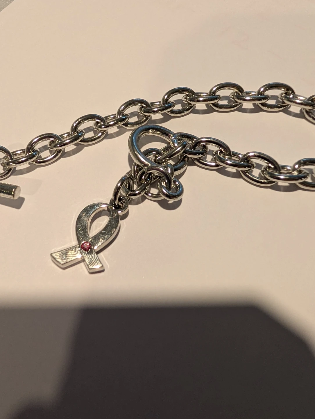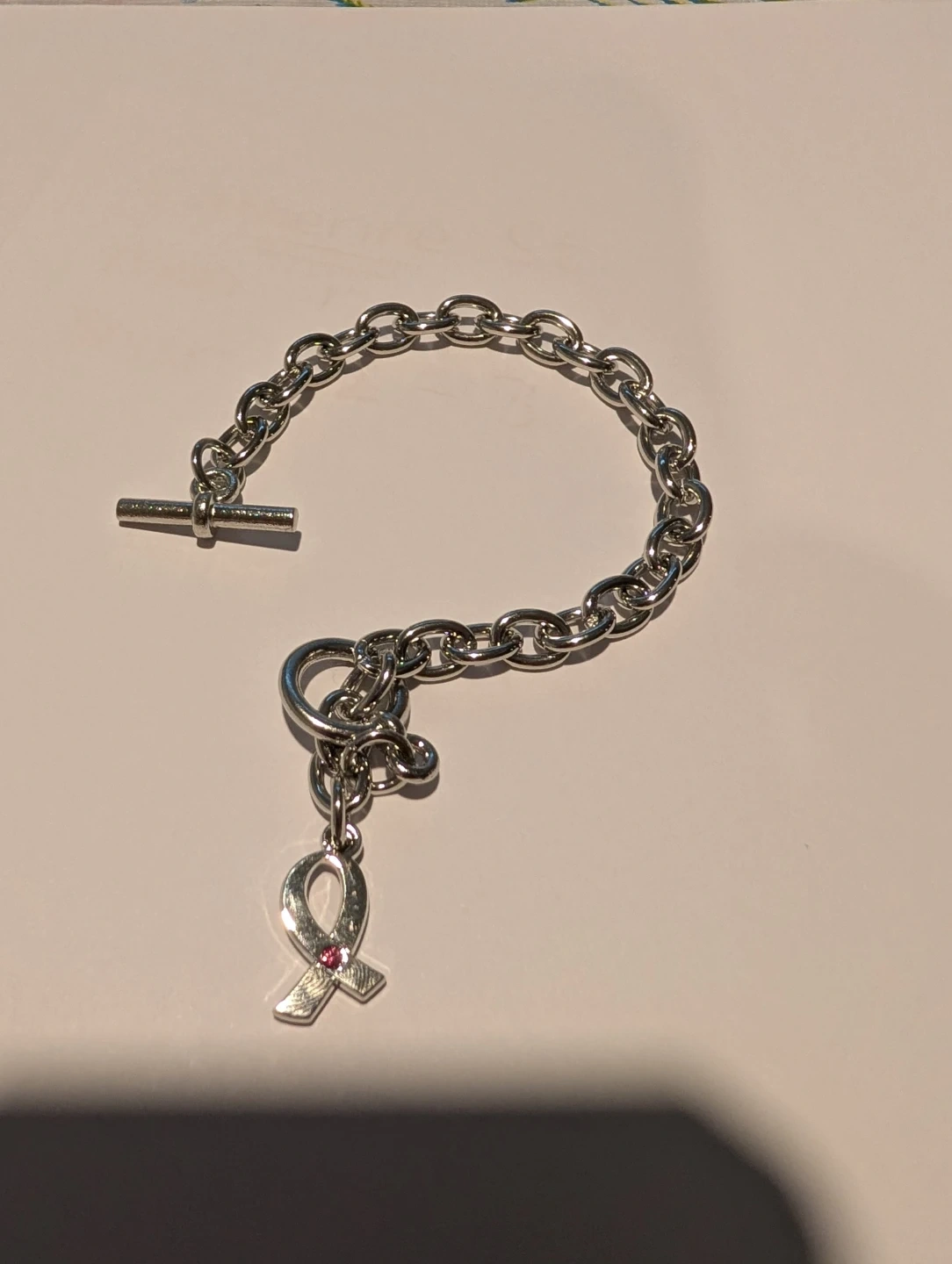 This silver tone charm bracelet features a toggle clasp and a pink ribbon charm accented with a small pink stone. It comes with a soft black velvet pouch for storage. Perfect for showing support or adding a touch of elegance! Only two left.