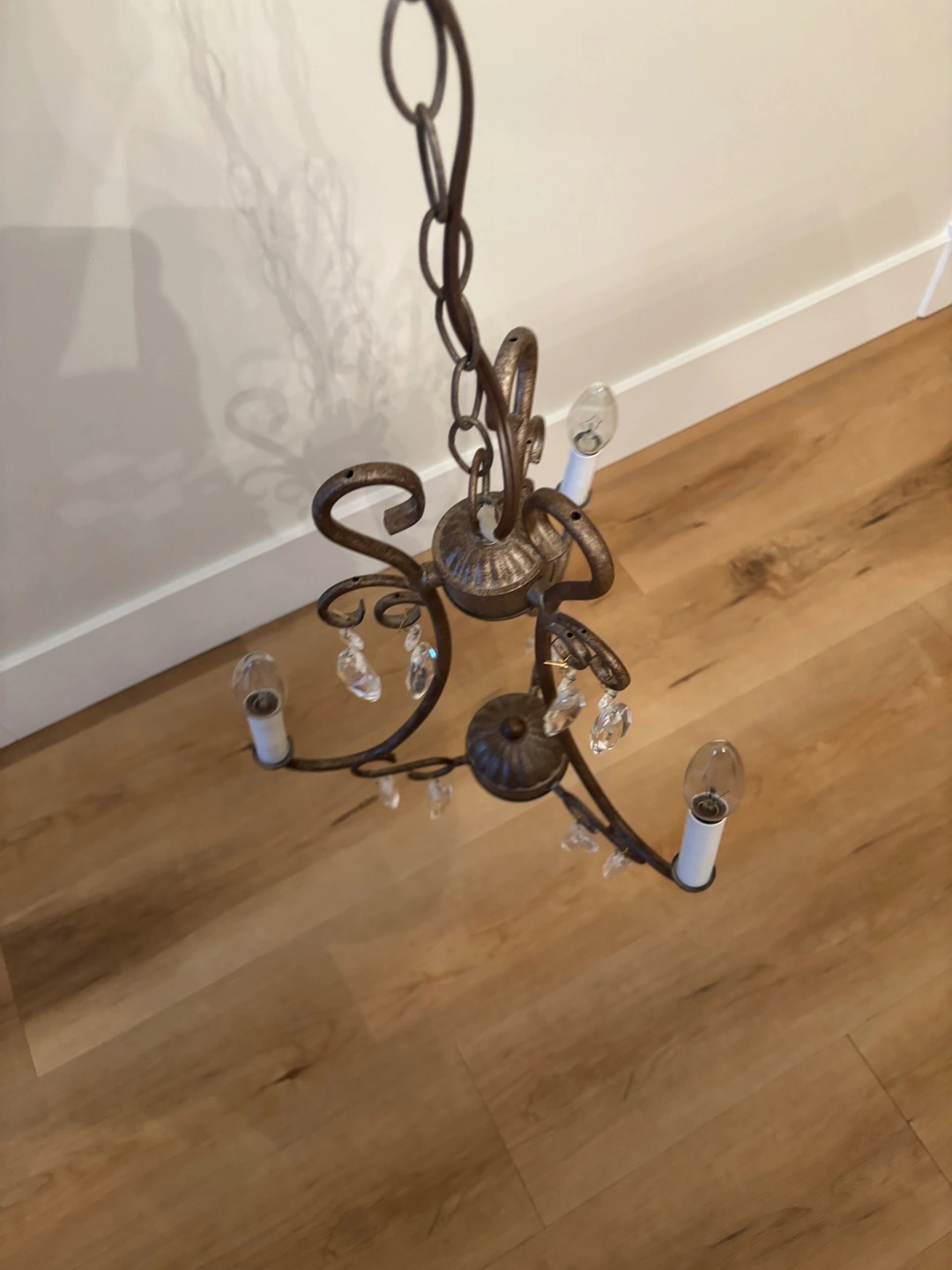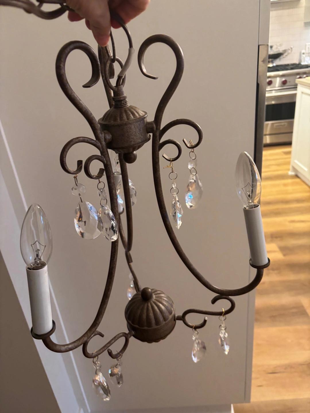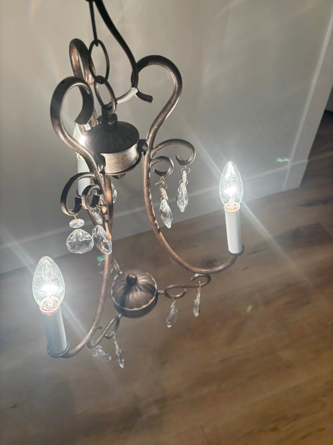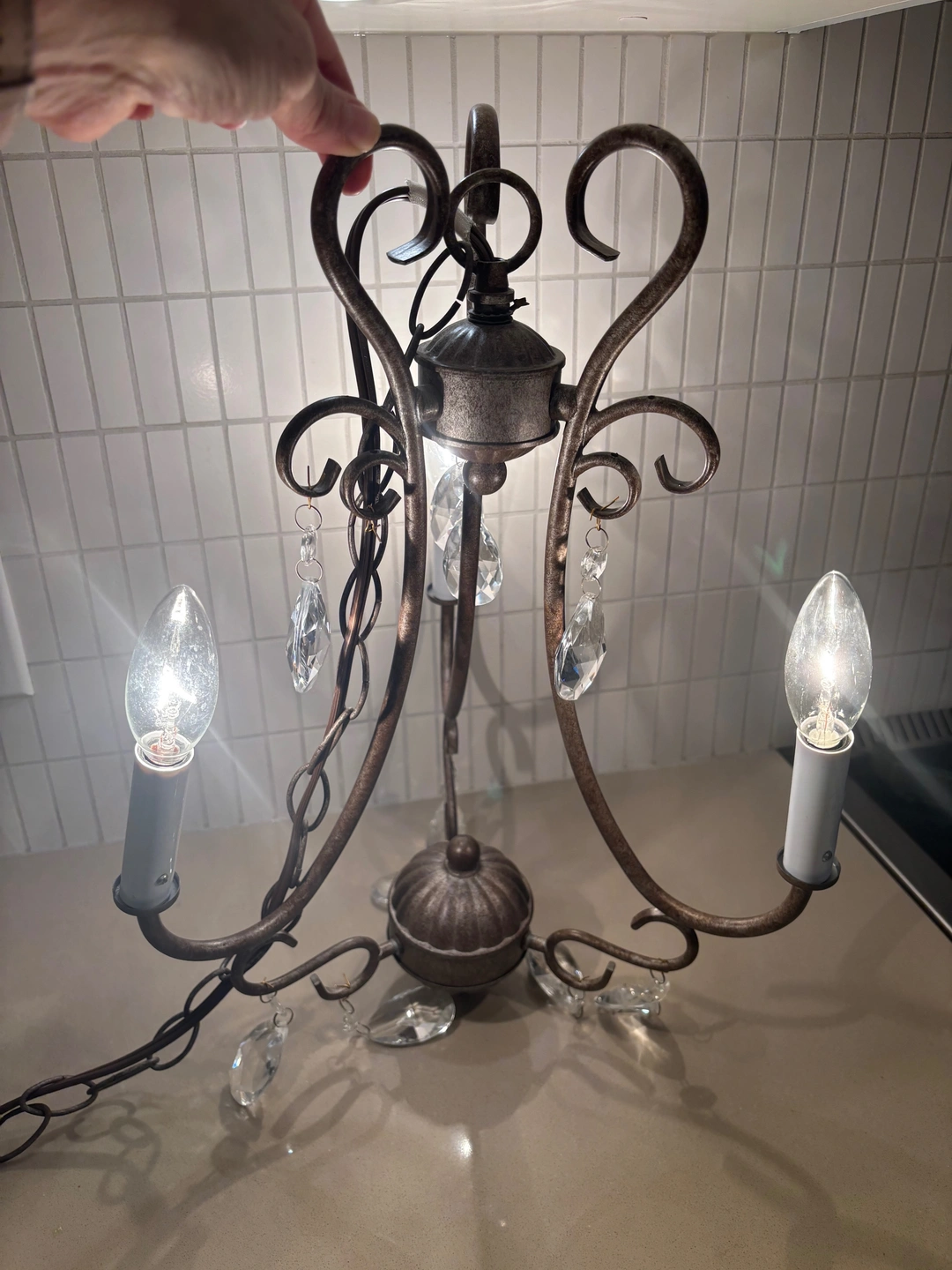 Crystal chandelier, 3 light, plug in & hang anywhere. Extremely long cord. Fixture measures; 18 inches tall & 12 inches wide