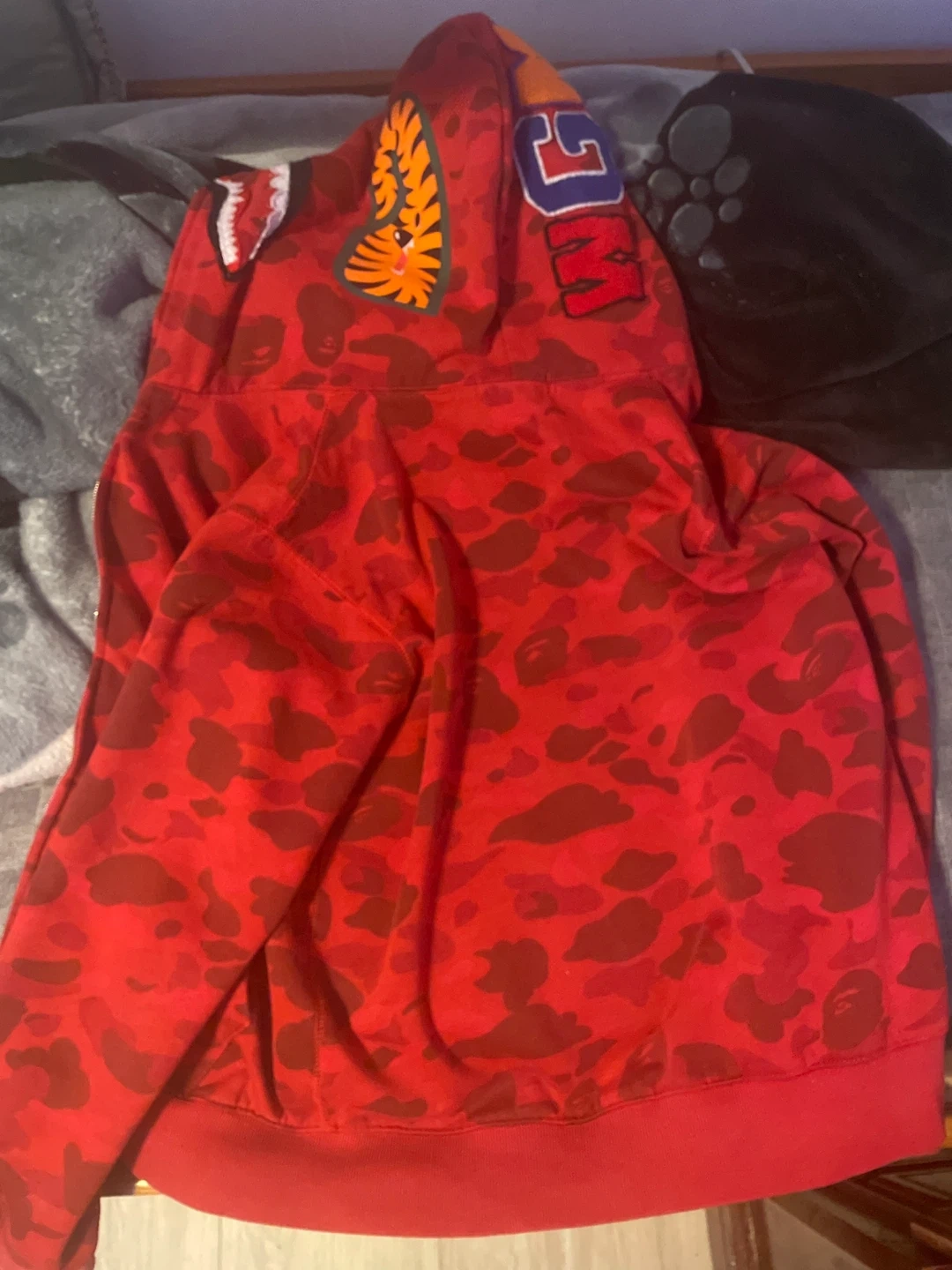 BAPE full zip hoodie in red camo. Features the iconic shark graphic and "WGM" text on the hood. Made from comfortable material for everyday wear.