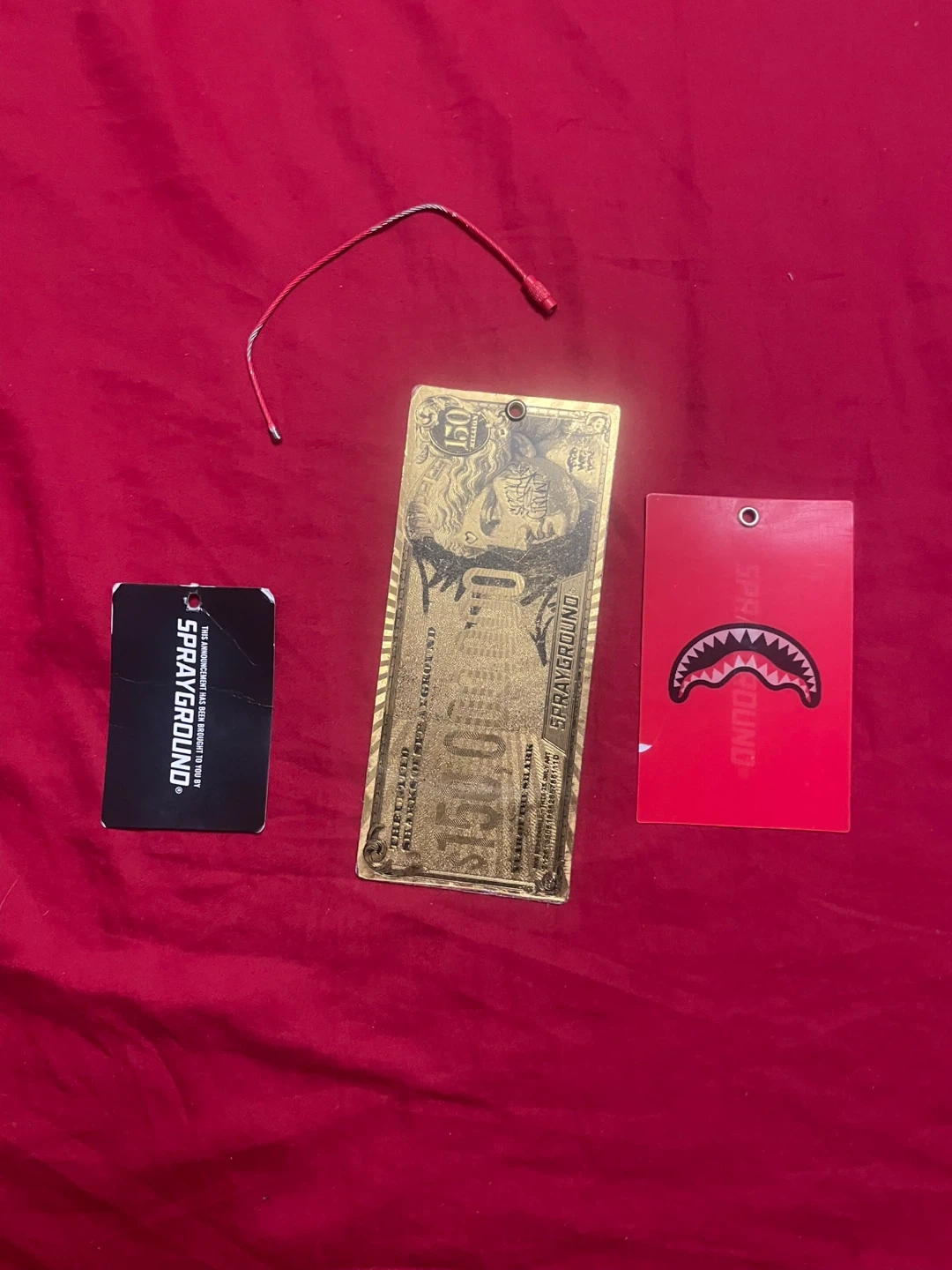 Set of Sprayground bag tags. Includes a red shark-themed tag and a gold dollar bill design tag. Also comes with a red and grey string attachment.
