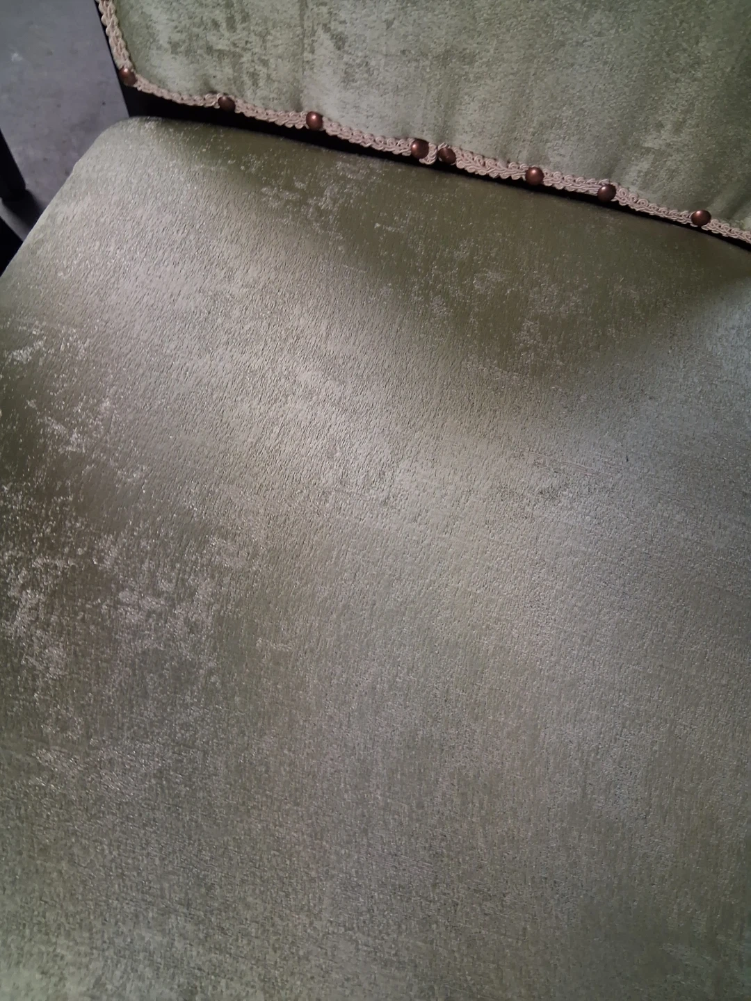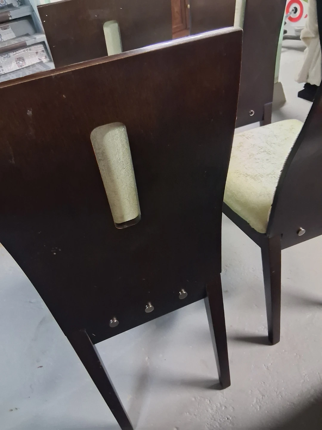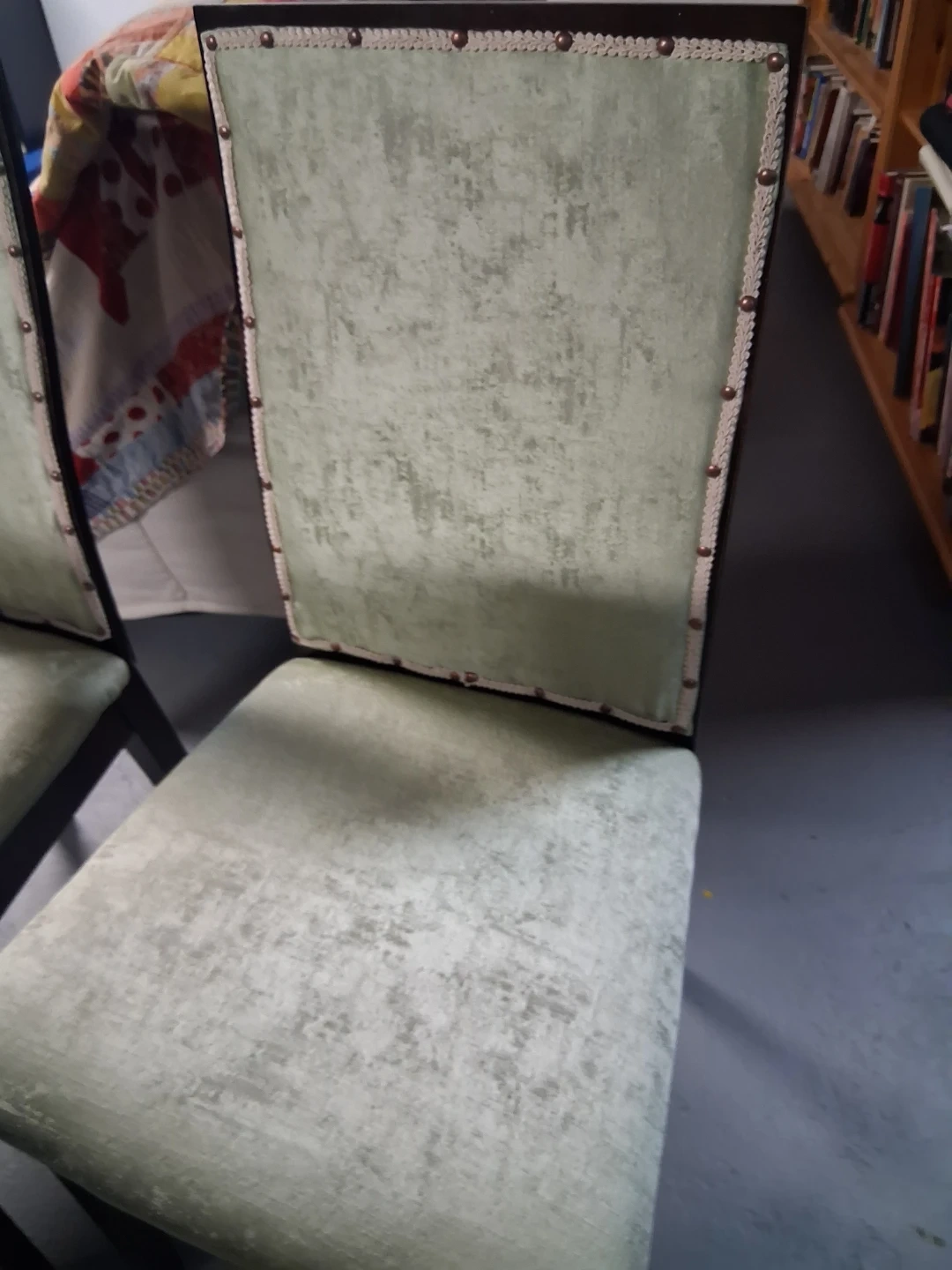 Selling a set of four dining chairs with a light sage green chintz upholstery. These chairs have dark wood legs and decorative nailhead trim along the back. They'd make a nice addition to any dining room!